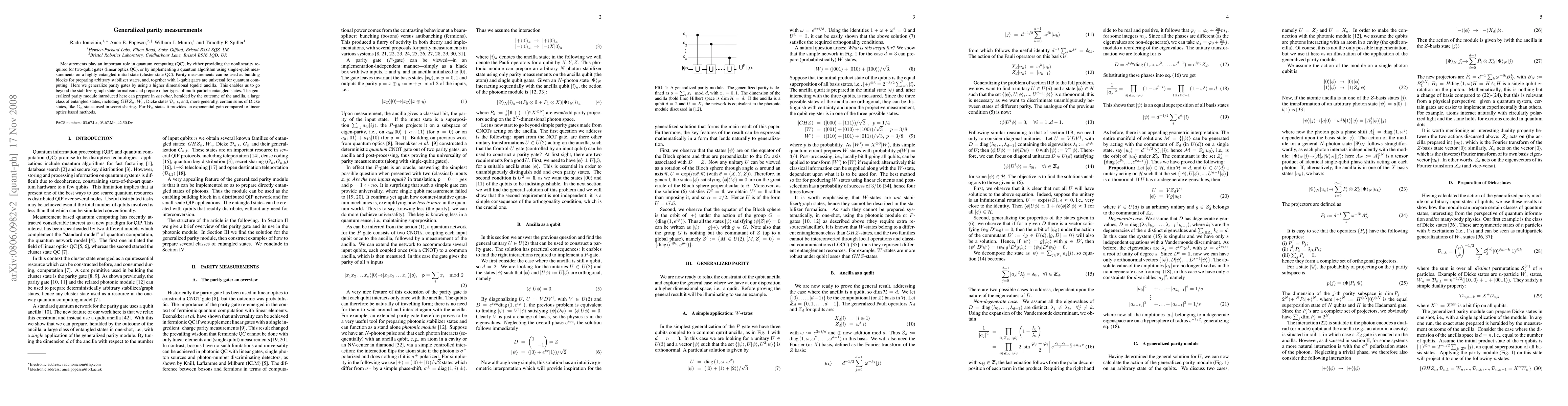 Measurements play an important role in quantum computing (QC), by either providing the nonlinearity required for two-qubit gates (linear optics QC), or by implementing a quantum algorithm using single-qubit measurements on a highly entangled initial state (cluster state QC). Parity measurements can be used as building blocks for preparing arbitrary stabilizer states, and, together with 1-qubit gates are universal for quantum computing. Here we generalize parity gates by using a higher dimensional (qudit) ancilla. This enables us to go beyond the stabilizer/graph state formalism and prepare other types of multi-particle entangled states. The generalized parity module introduced here can prepare in one-shot, heralded by the outcome of the ancilla, a large class of entangled states, including GHZ_n, W_n, Dicke states D_{n,k}, and, more generally, certain sums of Dicke states, like G_n states used in secret sharing. For W_n states it provides an exponential gain compared to linear optics based methods.