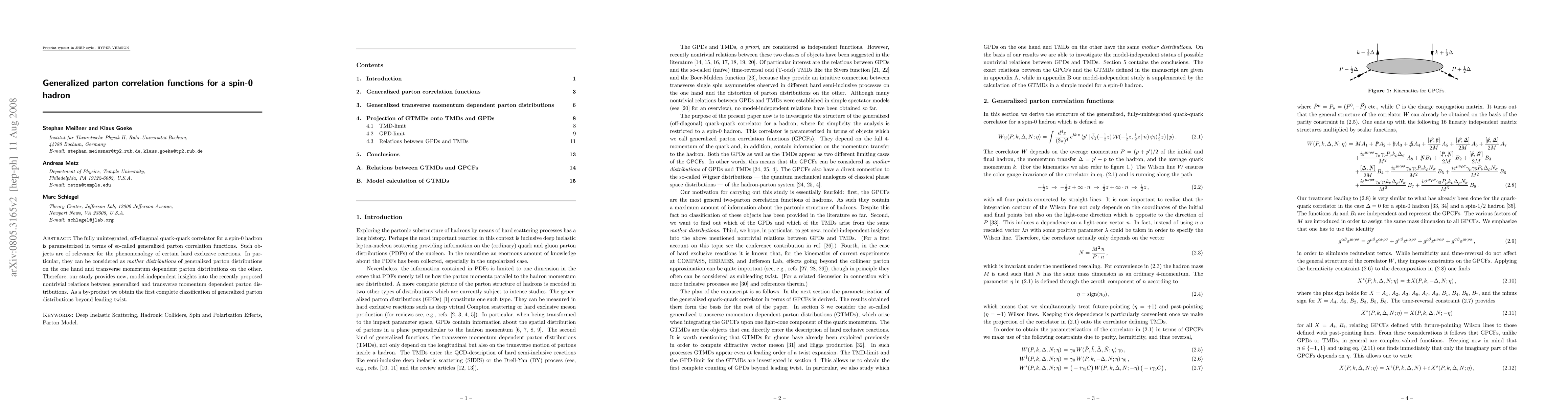 This research introduces generalized parton correlation functions for spin-0 hadrons, serving as 'mother distributions' for both generalized parton distributions and transverse momentum dependent parton distributions. It provides new model-independent insights into their relations and offers the first complete classification of generalized parton distributions beyond leading twist.