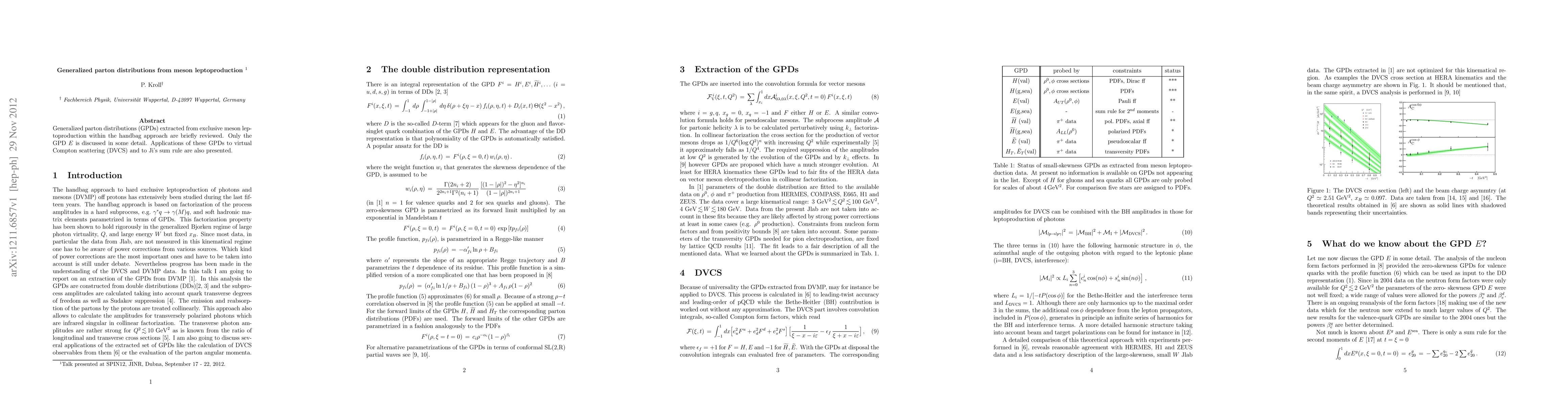 This paper reviews generalized parton distributions (GPDs) derived from meson leptoproduction, focusing on the GPD E, and discusses their applications to virtual Compton scattering and Ji's sum rule.