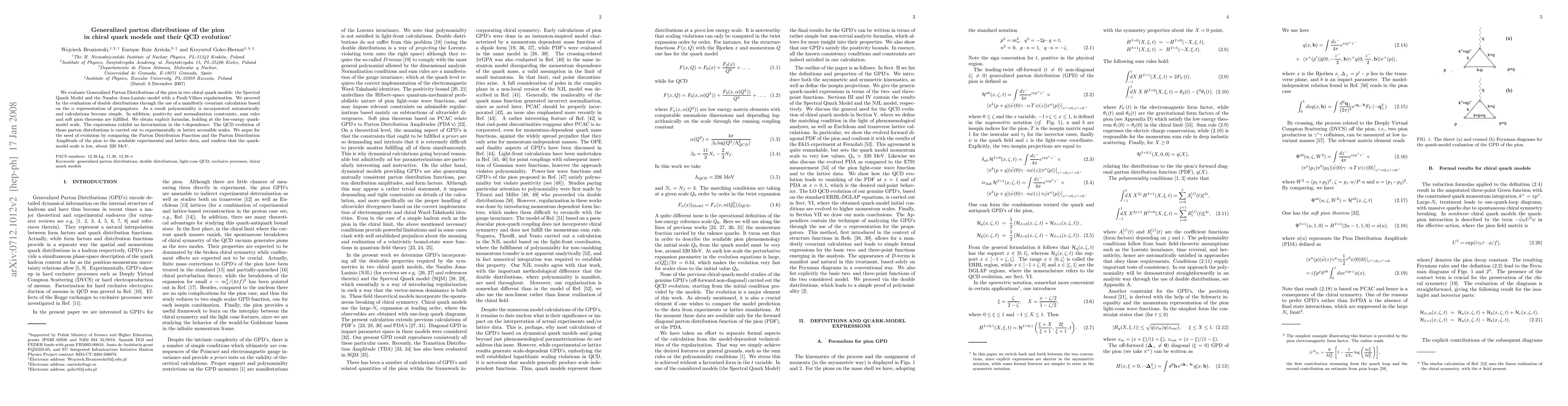 This paper evaluates Generalized Parton Distributions (GPDs) of the pion using two chiral quark models and studies their QCD evolution, finding that the expressions do not factorize in the t-dependence. The results are compared with experimental and lattice data to confirm the necessity of QCD evolution.