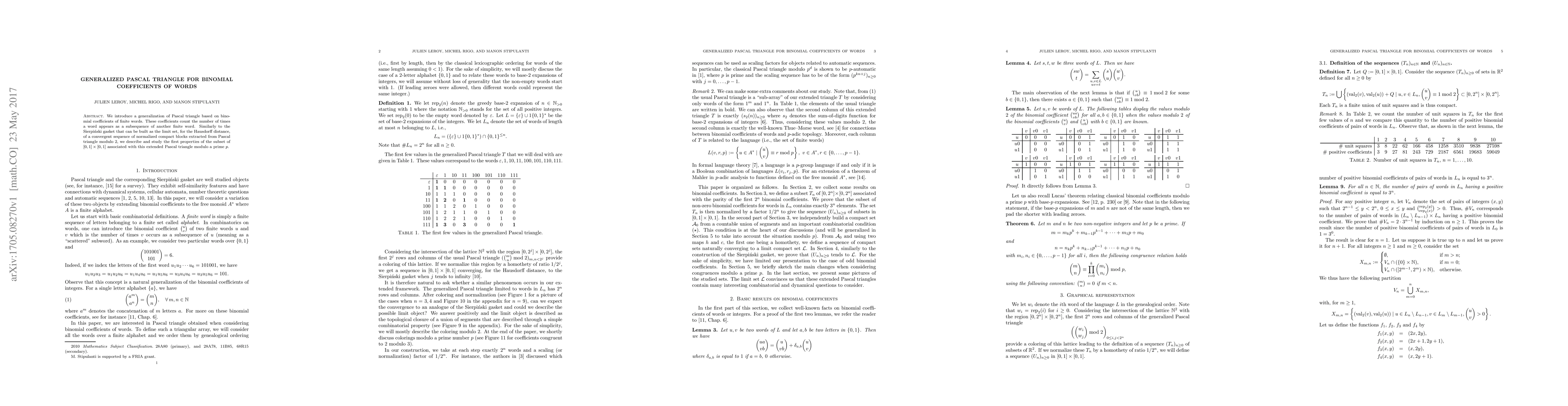 This paper generalizes Pascal's triangle using binomial coefficients of finite words to count subsequence occurrences. It explores the properties of a subset in $[0, 1] \times [0, 1]$ associated with this extended triangle modulo a prime $p$, akin to the Sierpiński gasket.