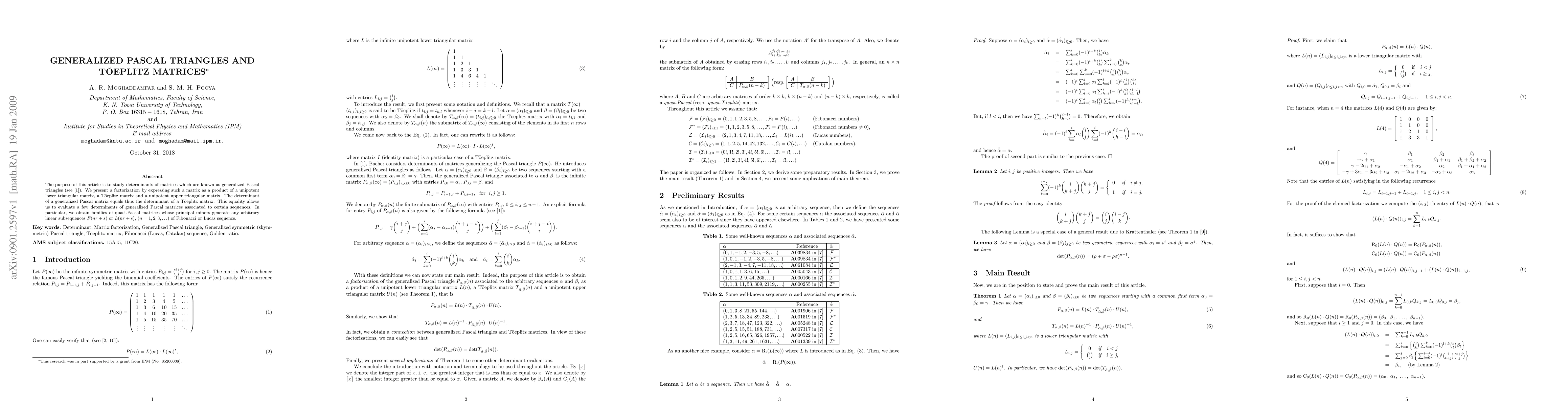 This paper explores determinants of generalized Pascal triangle matrices, factorizing them into a product of unipotent triangular matrices and a Toeplitz matrix, showing that their determinants are equivalent to those of the Toeplitz matrices. It also identifies quasi-Pascal matrices generating Fibonacci or Lucas sequences.