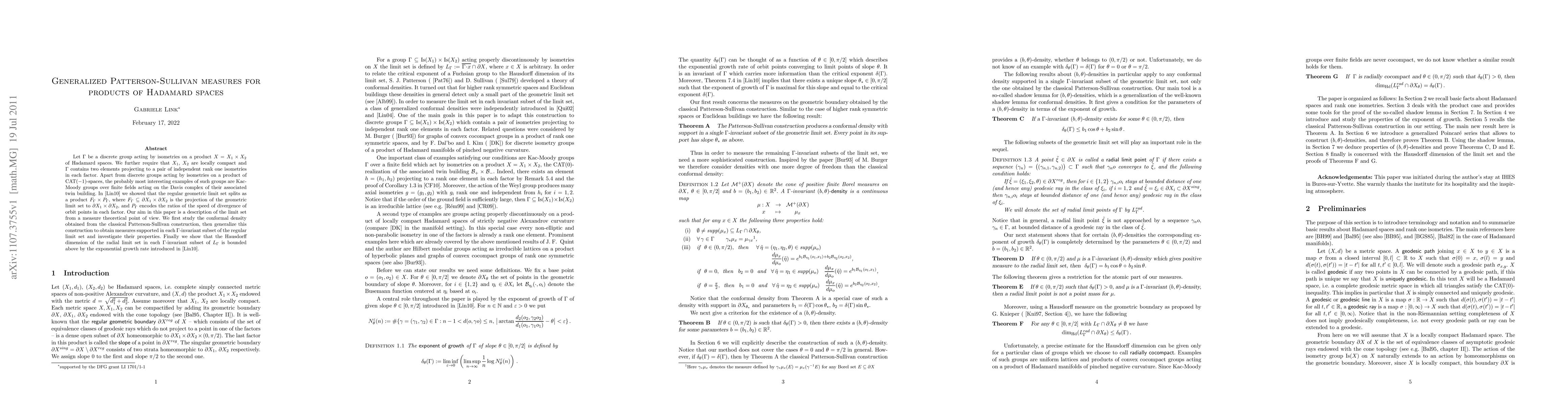 Let $\Gamma$ be a discrete group acting by isometries on a product $X=X_1\times X_2$ of Hadamard spaces. We further require that $X_1$, $X_2$ are locally compact and $\Gamma$ contains two elements projecting to a pair of independent rank one isometries in each factor. Apart from discrete groups acting by isometries on a product of CAT(-1)-spaces, the probably most interesting examples of such groups are Kac-Moody groups over finite fields acting on the Davis complex of their associated twin building. In a previous article we showed that the regular geometric limit set $\Lim$ splits as a product $F_\Gamma\times P_\Gamma$, where $F_\Gamma\subseteq\rand_1\times \rand_2$ is the projection of the geometric limit set to $\rand_1\times \rand_2$, and $P_\Gamma$ encodes the ratios of the speed of divergence of orbit points in each factor. Our aim in this paper is a description of the limit set from a measure theoretical point of view. We first study the conformal density obtained from the classical Patterson-Sullivan construction, then generalize this construction to obtain measures supported in each $\Gamma$-invariant subset of the regular limit set and investigate their properties. Finally we show that the Hausdorff dimension of the radial limit set in each $\Gamma$-invariant subset of $\Lim$ is bounded above by the exponential growth rate introduced in the previous article.