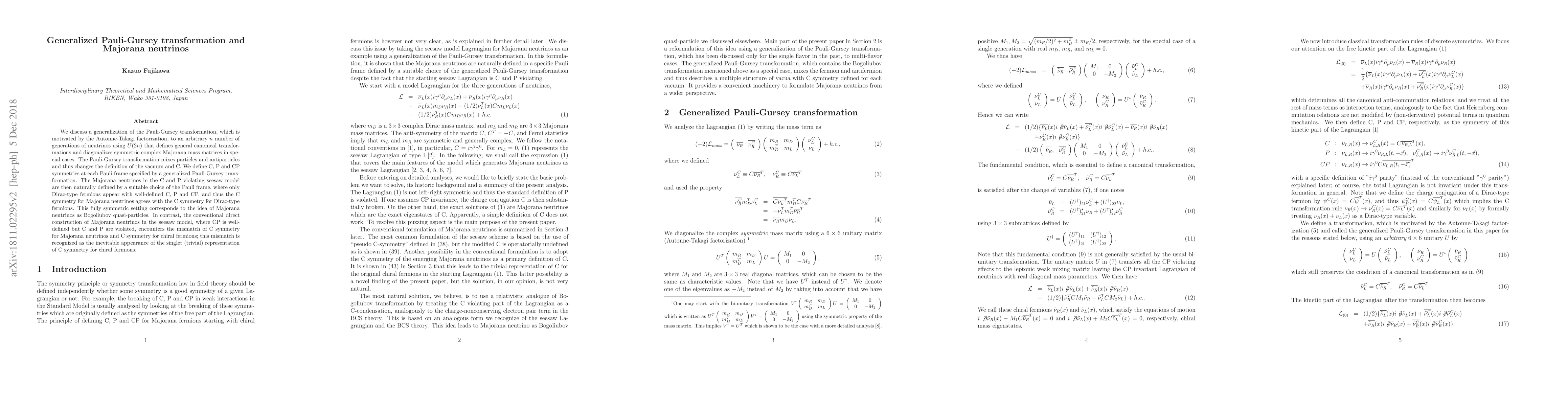 We discuss a generalization of the Pauli-Gursey transformation, which is motivated by the Autonne-Takagi factorization, to an arbitrary $n$ number of generations of neutrinos using $U(2n)$ that defines general canonical transformations and diagonalizes symmetric complex Majorana mass matrices in special cases. The Pauli-Gursey transformation mixes particles and antiparticles and thus changes the definition of the vacuum and C. We define C, P and CP symmetries at each Pauli frame specified by a generalized Pauli-Gursey transformation. The Majorana neutrinos in the C and P violating seesaw model are then naturally defined by a suitable choice of the Pauli frame, where only Dirac-type fermions appear with well-defined C, P and CP, and thus the C symmetry for Majorana neutrinos agrees with the C symmetry for Dirac-type fermions. This fully symmetric setting corresponds to the idea of Majorana neutrinos as Bogoliubov quasi-particles. In contrast, the conventional direct construction of Majorana neutrinos in the seesaw model, where CP is well-defined but C and P are violated, encounters the mismatch of C symmetry for Majorana neutrinos and C symmetry for chiral fermions; this mismatch is recognized as the inevitable appearance of the singlet (trivial) representation of C symmetry for chiral fermions.
