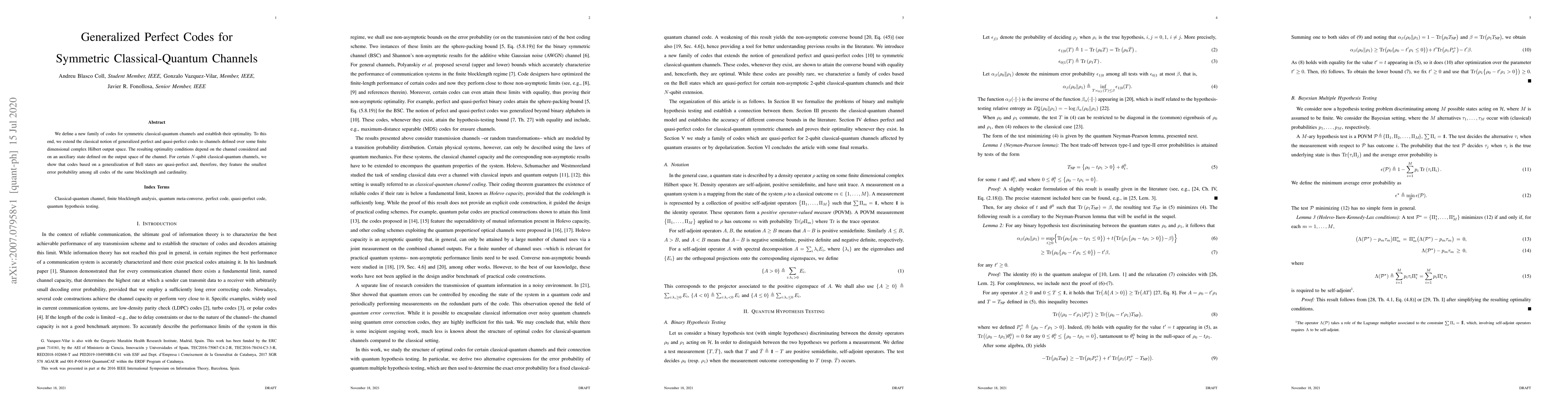 The research extends classical coding theory concepts to symmetric classical-quantum channels, defining generalized perfect and quasi-perfect codes for such channels and proving their optimality through the meta-converse bound.