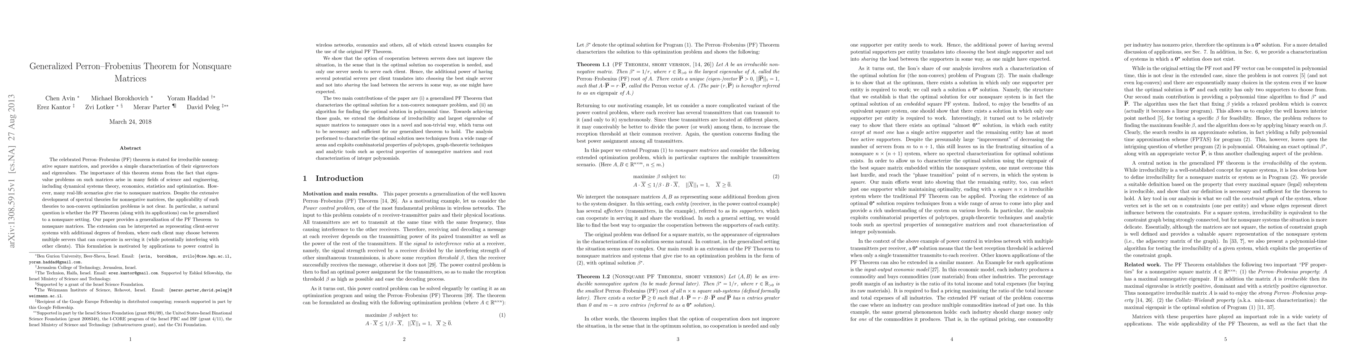 The celebrated Perron--Frobenius (PF) theorem is stated for irreducible nonnegative square matrices, and provides a simple characterization of their eigenvectors and eigenvalues. The importance of this theorem stems from the fact that eigenvalue problems on such matrices arise in many fields of science and engineering, including dynamical systems theory, economics, statistics and optimization. However, many real-life scenarios give rise to nonsquare matrices. A natural question is whether the PF Theorem (along with its applications) can be generalized to a nonsquare setting. Our paper provides a generalization of the PF Theorem to nonsquare matrices. The extension can be interpreted as representing client-server systems with additional degrees of freedom, where each client may choose between multiple servers that can cooperate in serving it (while potentially interfering with other clients). This formulation is motivated by applications to power control in wireless networks, economics and others, all of which extend known examples for the use of the original PF Theorem. We show that the option of cooperation between servers does not improve the situation, in the sense that in the optimal solution no cooperation is needed, and only one server needs to serve each client. Hence, the additional power of having several potential servers per client translates into \emph{choosing} the best single server and not into \emph{sharing} the load between the servers in some way, as one might have expected. The two main contributions of the paper are (i) a generalized PF Theorem that characterizes the optimal solution for a non-convex nonsquare problem, and (ii) an algorithm for finding the optimal solution in polynomial time.