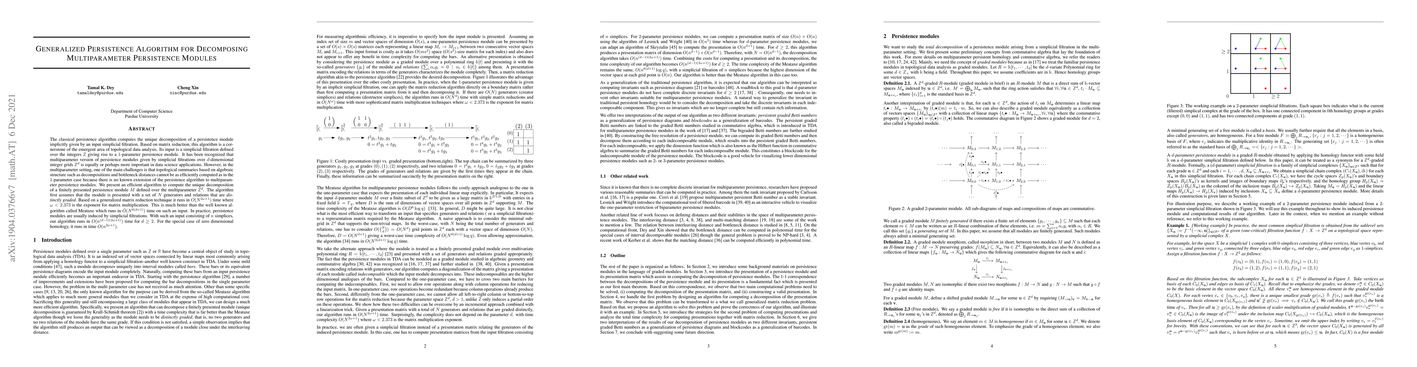 This paper introduces an efficient algorithm for decomposing multi-parameter persistence modules, addressing the computational challenge of multiparameter topological data analysis. The proposed generalized persistence algorithm outperforms existing methods, running in $O(N^{2\omega+1})$ time, significantly faster than the Meataxe algorithm.