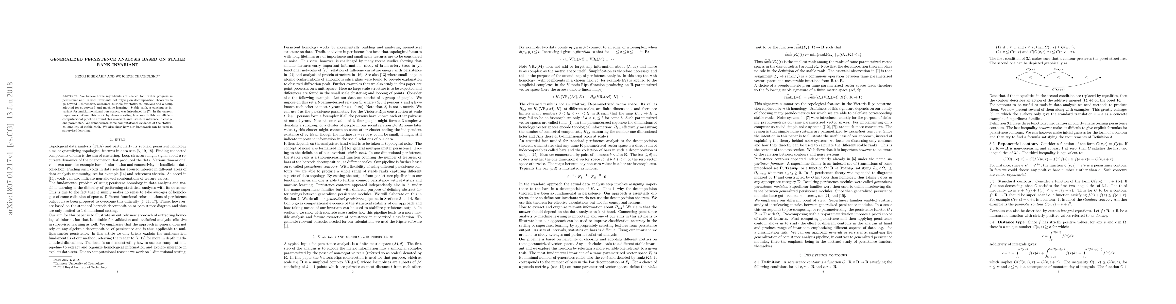 We believe three ingredients are needed for further progress in persistence and its use: invariants not relying on decomposition theorems to go beyond 1-dimension, outcomes suitable for statistical analysis and a setup adopted for supervised and machine learning. Stable rank, a continuous invariant for multidimensional persistence, was introduced in W. Chacholski et al. - Multidimensional persistence and noise, 2017. In the current paper we continue this work by demonstrating how one builds an efficient computational pipeline around this invariant and uses it in inference in case of one parameter. We demonstrate some computational evidence of the statistical stability of stable rank. We also show how our framework can be used in supervised learning.
