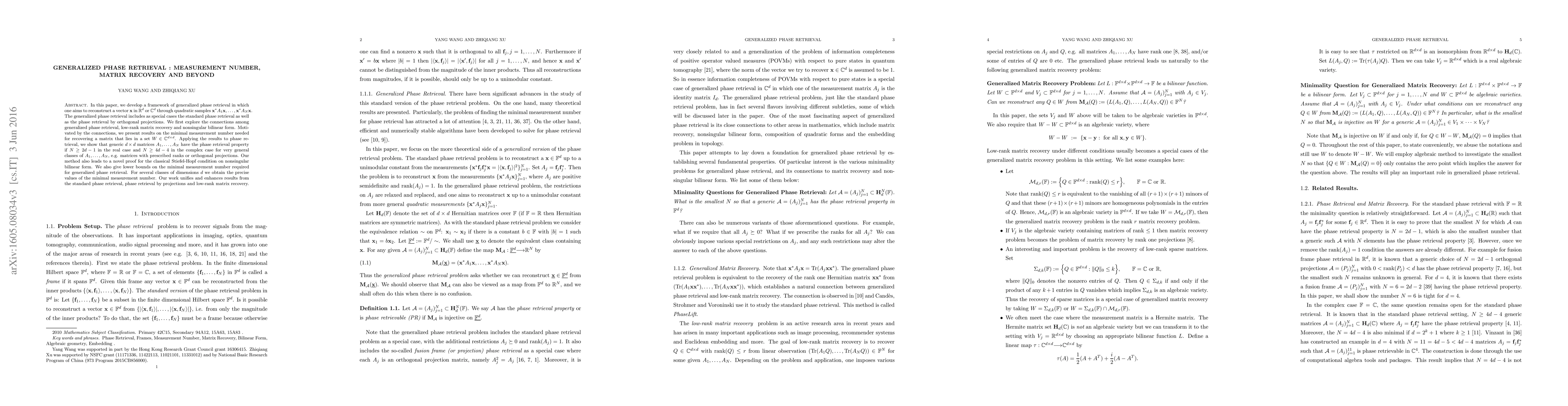 This paper develops a generalized framework for phase retrieval, exploring connections to low-rank matrix recovery and bilinear forms. It establishes minimal measurement numbers for matrix recovery and phase retrieval, proving that $N\geq 2d-1$ and $N\geq 4d-4$ measurements are sufficient for real and complex cases respectively, and provides novel proofs for classical conditions.