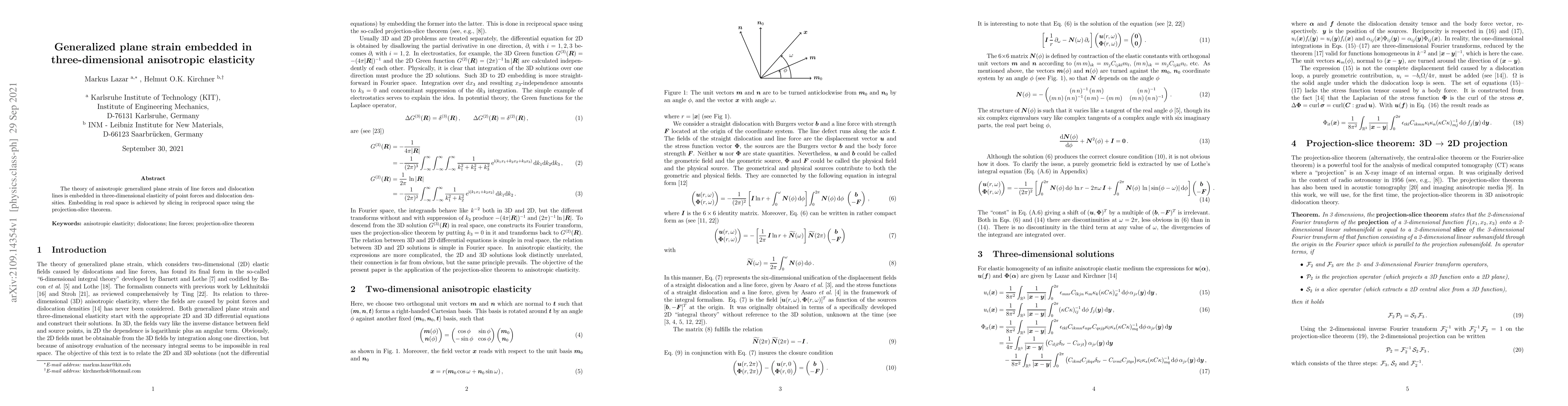 The theory of anisotropic generalized plane strain of line forces and dislocation lines is embedded in three-dimensional elasticity of point forces and dislocation densities. Embedding in real space is achieved by slicing in reciprocal space using the projection-slice theorem.
