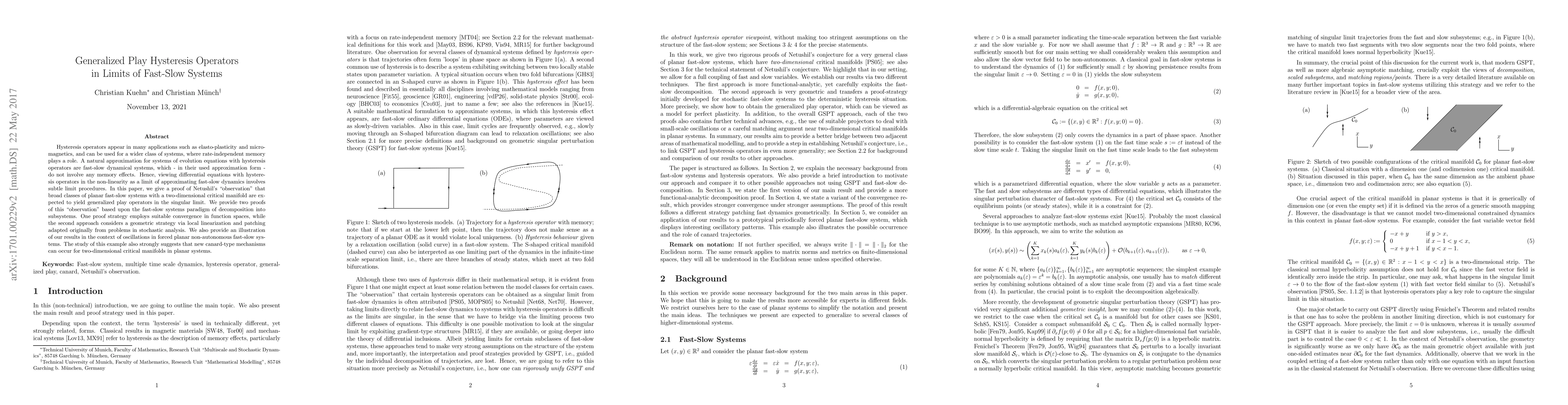 This paper explores the limit behavior of fast-slow dynamical systems to derive generalized play hysteresis operators, proving Netushil's observation through two distinct approaches: one based on function space convergence and another using geometric methods involving local linearization. The study highlights potential new canard-type mechanisms in planar systems.