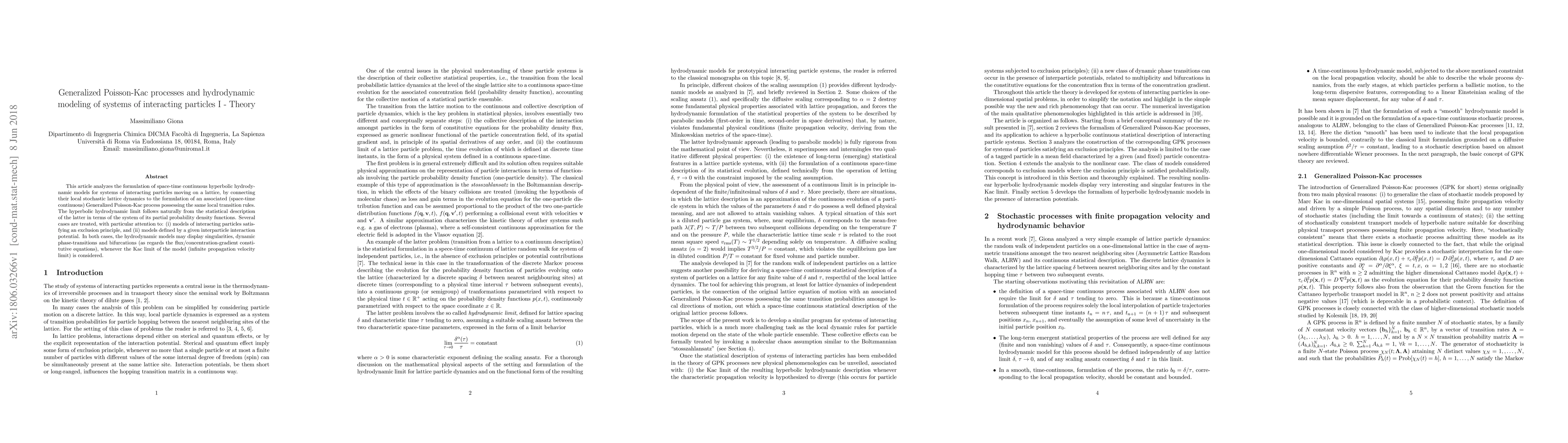 This paper develops a theoretical framework for hydrodynamic models of interacting particle systems using Generalized Poisson-Kac processes, focusing on systems with exclusion principles and specific interparticle interactions, and explores singularities, phase transitions, and bifurcations in these models.