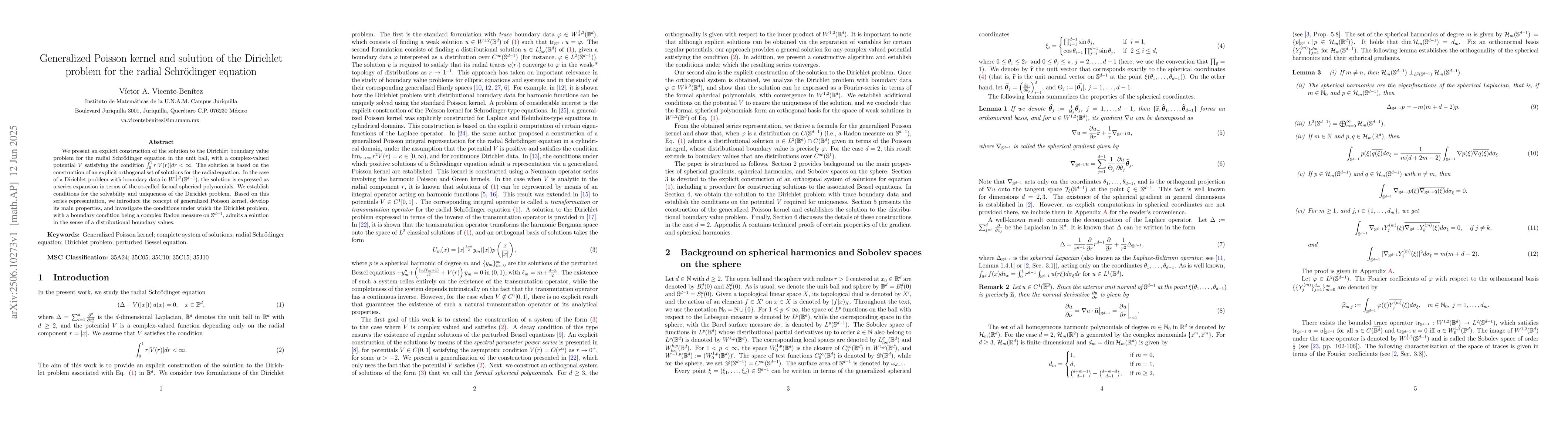 We present an explicit construction of the solution to the Dirichlet boundary value problem for the radial Schr\"odinger equation in the unit ball, with a complex-valued potential $V$ satisfying the condition $\int_0^1r|V(r)|dr<\infty$. The solution is based on the construction of an explicit orthogonal set of solutions for the radial equation. In the case of a Dirichlet problem with boundary data in $W^{\frac{1}{2},2}(\mathbb{S}^{d-1})$, the solution is expressed as a series expansion in terms of the so-called formal spherical polynomials. We establish conditions for the solvability and uniqueness of the Dirichlet problem. Based on this series representation, we introduce the concept of generalized Poisson kernel, develop its main properties, and investigate the conditions under which the Dirichlet problem, with a boundary condition being a complex Radon measure on $\mathbb{S}^{d-1}$, admits a solution in the sense of a distributional boundary values.