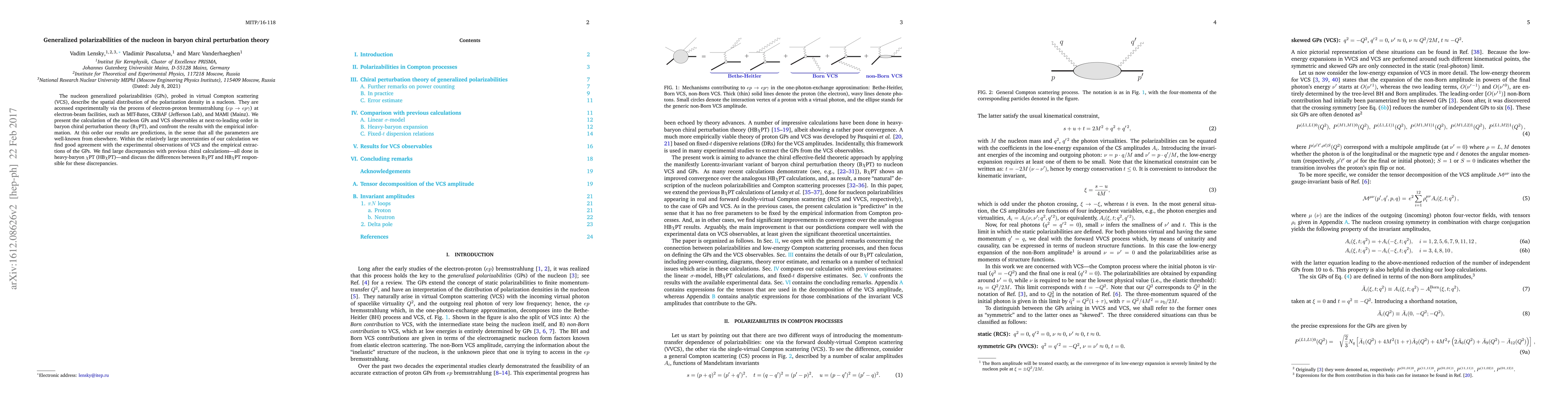 The nucleon generalized polarizabilities (GPs), probed in virtual Compton scattering (VCS), describe the spatial distribution of the polarization density in a nucleon. They are accessed experimentally via the process of electron-proton bremsstrahlung ($ep\to ep\gamma$) at electron-beam facilities, such as MIT-Bates, CEBAF (Jefferson Lab), and MAMI (Mainz). We present the calculation of the nucleon GPs and VCS observables at next-to-leading order in baryon chiral perturbation theory (B$\chi$PT), and confront the results with the empirical information. At this order our results are predictions, in the sense that all the parameters are well-known from elsewhere. Within the relatively large uncertainties of our calculation we find good agreement with the experimental observations of VCS and the empirical extractions of the GPs. We find large discrepancies with previous chiral calculations---all done in heavy-baryon $\chi$PT (HB$\chi$PT)---and discuss the differences between B$\chi$PT and HB$\chi$PT responsible for these discrepancies.