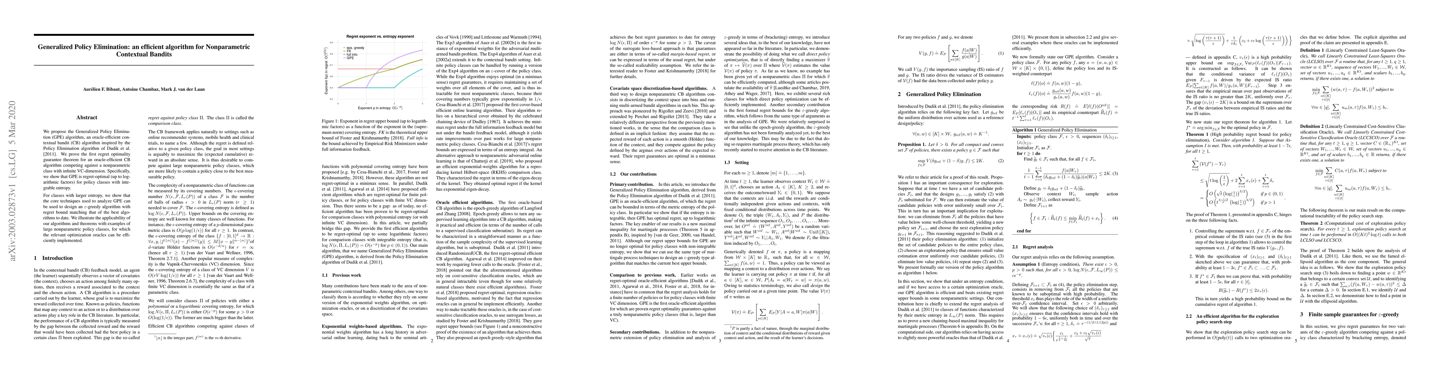 The Generalized Policy Elimination (GPE) algorithm is an oracle-efficient contextual bandit method that achieves regret optimality for nonparametric classes with infinite VC-dimension. It also provides a framework for designing $\varepsilon$-greedy algorithms for higher entropy classes.