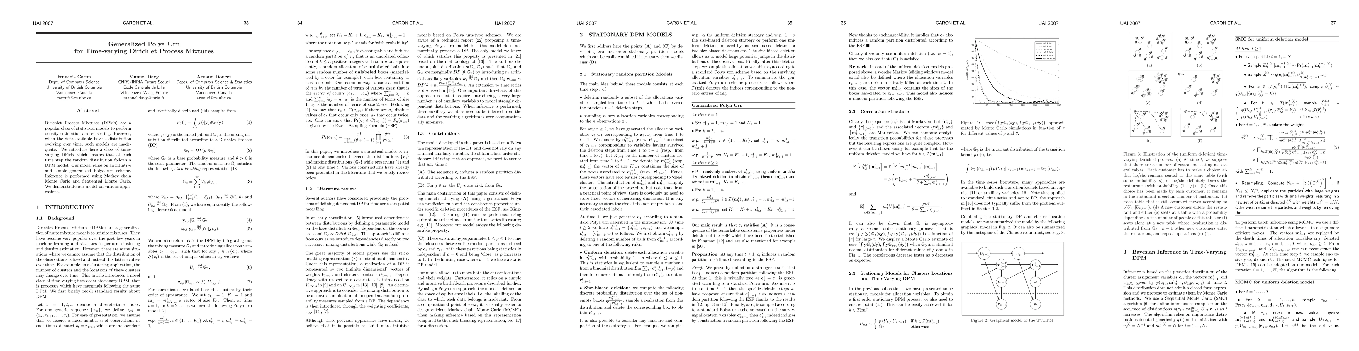 This paper introduces a time-varying Dirichlet Process Mixture model using a generalized Polya urn scheme to handle evolving data distributions over time. The model is inferred via Markov chain Monte Carlo and Sequential Monte Carlo methods, and its effectiveness is demonstrated through various applications.