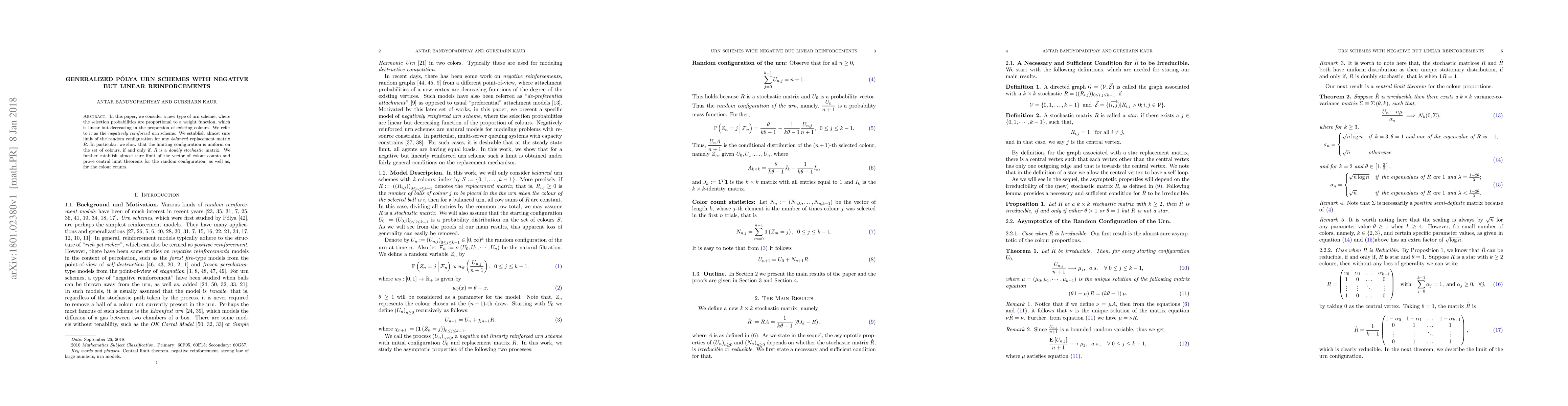 This paper introduces a novel urn scheme with negative linear reinforcement, where selection probabilities decrease with the proportion of existing colors. It establishes the almost sure limit of the random configuration and proves that the limiting configuration is uniform if the replacement matrix is doubly stochastic, along with central limit theorems for both the configuration and color counts.