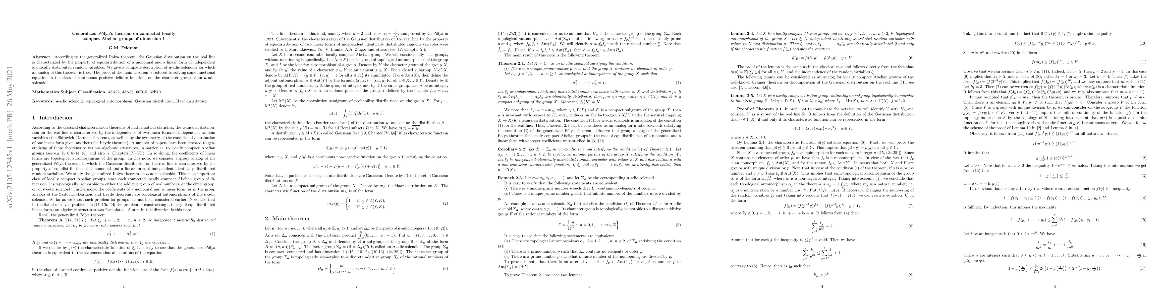 According to the generalized Polya theorem, the Gaussian distribution on the real line is characterized by the property of equidistribution of a monomial and a linear form of independent identically distributed random variables. We give a complete description of a-adic solenoids for which an analog of this theorem is true. The proof of the main theorem is reduced to solving some functional equation in the class of continuous positive definite functions on the character group of an a-adic solenoid
