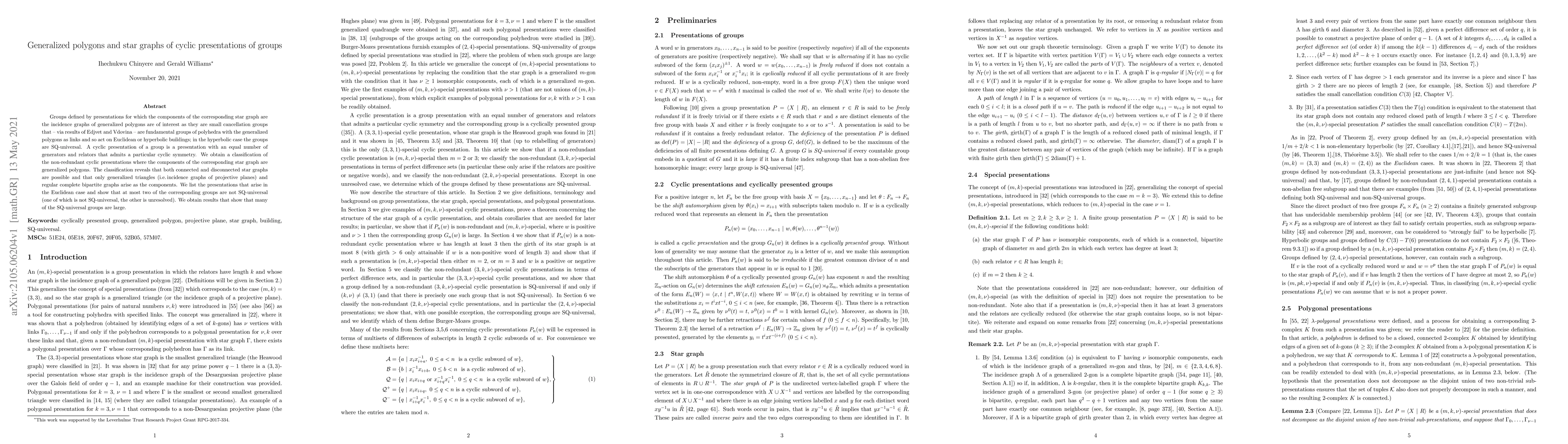 This paper classifies cyclic presentations of groups where the star graph components correspond to generalized polygons, revealing that only generalized triangles and regular complete bipartite graphs arise as components. It also shows that most of the resulting SQ-universal groups are large, with at most two exceptions in the Euclidean case.