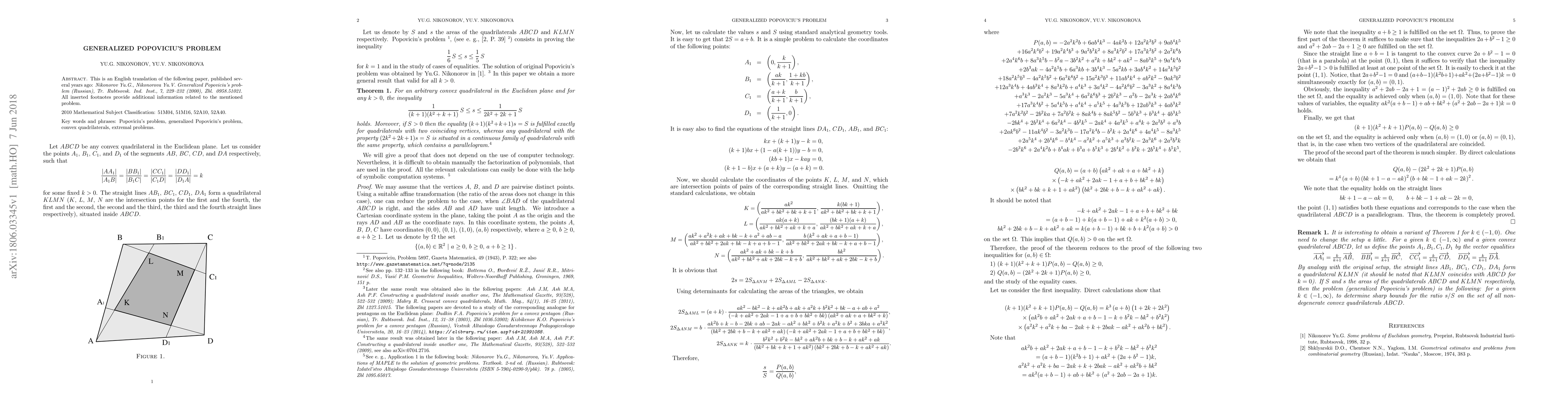 This is an English translation of the following paper, published several years ago: Nikonorov Yu.G., Nikonorova Yu.V. Generalized Popoviciu's problem (Russian), Tr. Rubtsovsk. Ind. Inst., 7, 229-232 (2000), Zbl. 0958.51021. All inserted footnotes provide additional information related to the mentioned problem.