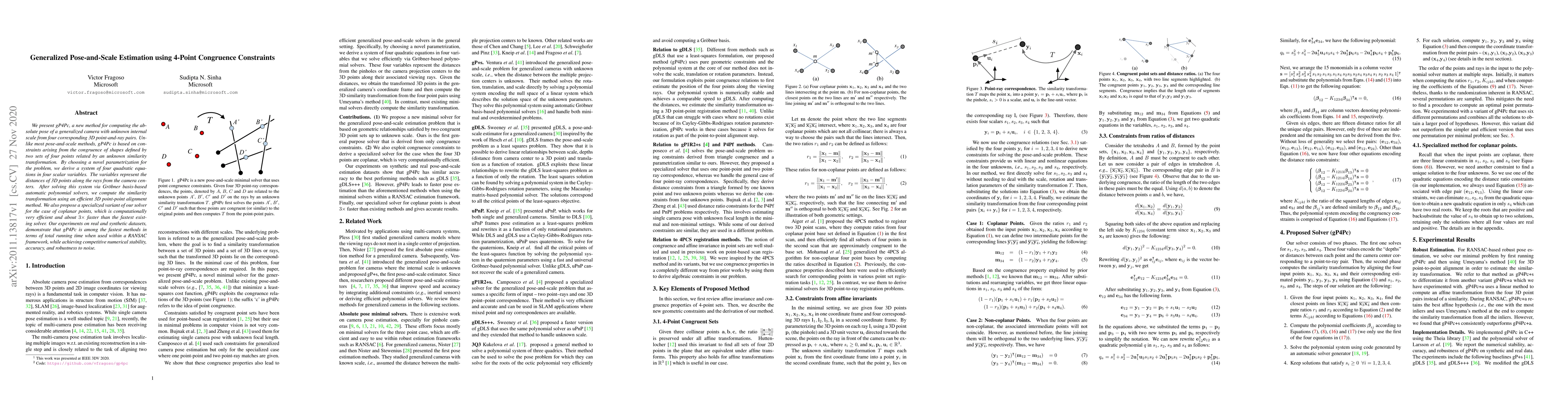 This paper introduces gP4Pc, a novel method for estimating the absolute pose and scale of a generalized camera using four 3D point-and-ray pairs, based on congruence constraints. It employs a system of quadratic equations and a Groebner basis solver for efficient computation, achieving high speed and accuracy in pose estimation.