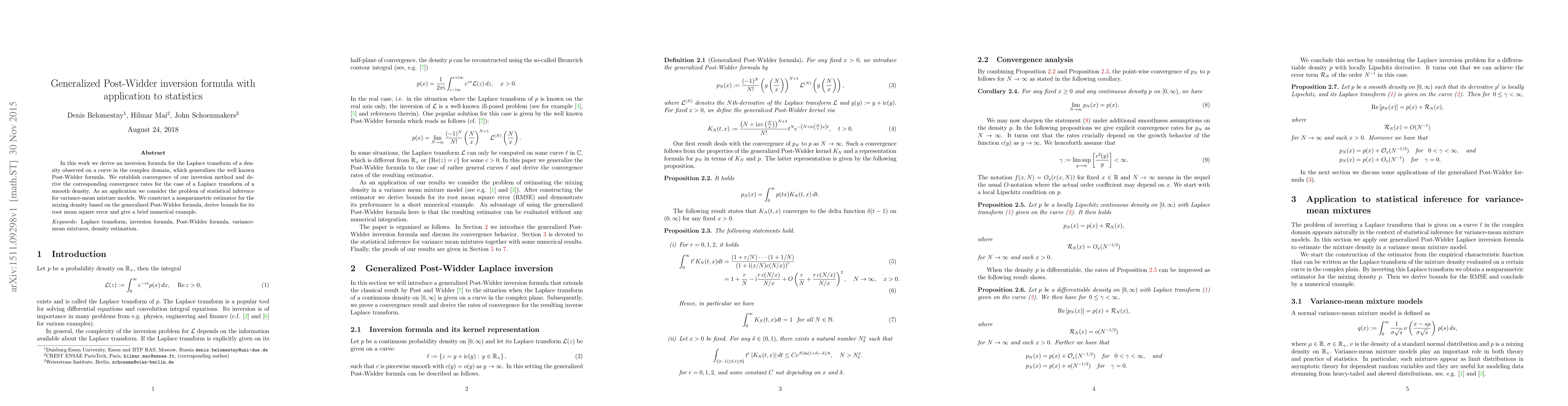 In this work we derive an inversion formula for the Laplace transform of a density observed on a curve in the complex domain, which generalizes the well known Post-Widder formula. We establish convergence of our inversion method and derive the corresponding convergence rates for the case of a Laplace transform of a smooth density. As an application we consider the problem of statistical inference for variance-mean mixture models. We construct a nonparametric estimator for the mixing density based on the generalized Post-Widder formula, derive bounds for its root mean square error and give a brief numerical example.