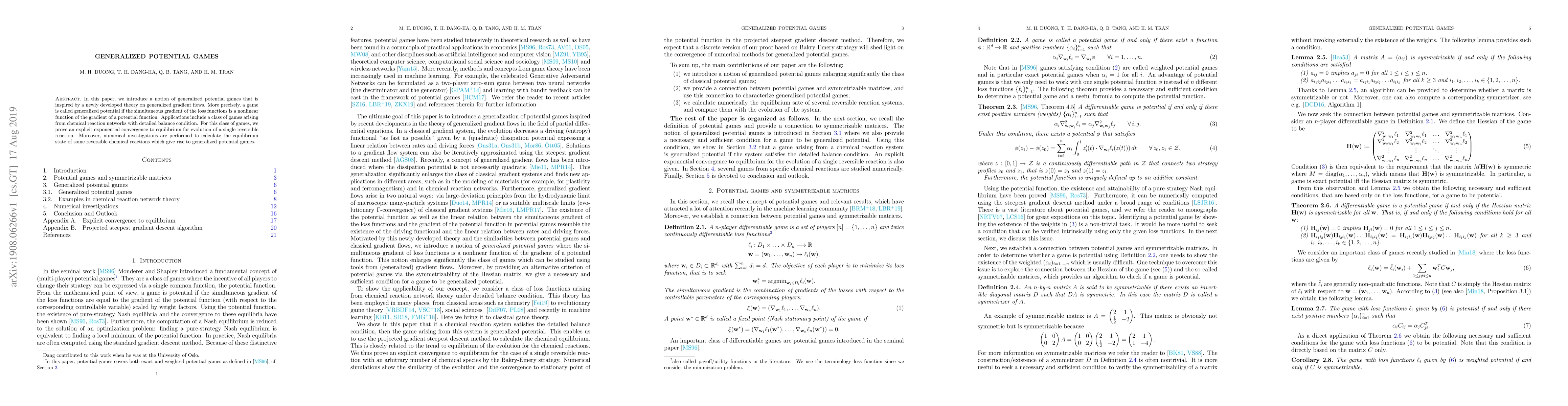 This paper introduces generalized potential games, defined by a nonlinear relationship between the gradient of loss functions and a potential function, inspired by gradient flow theory. It demonstrates exponential convergence to equilibrium for reversible chemical reactions and conducts numerical investigations to determine equilibrium states.