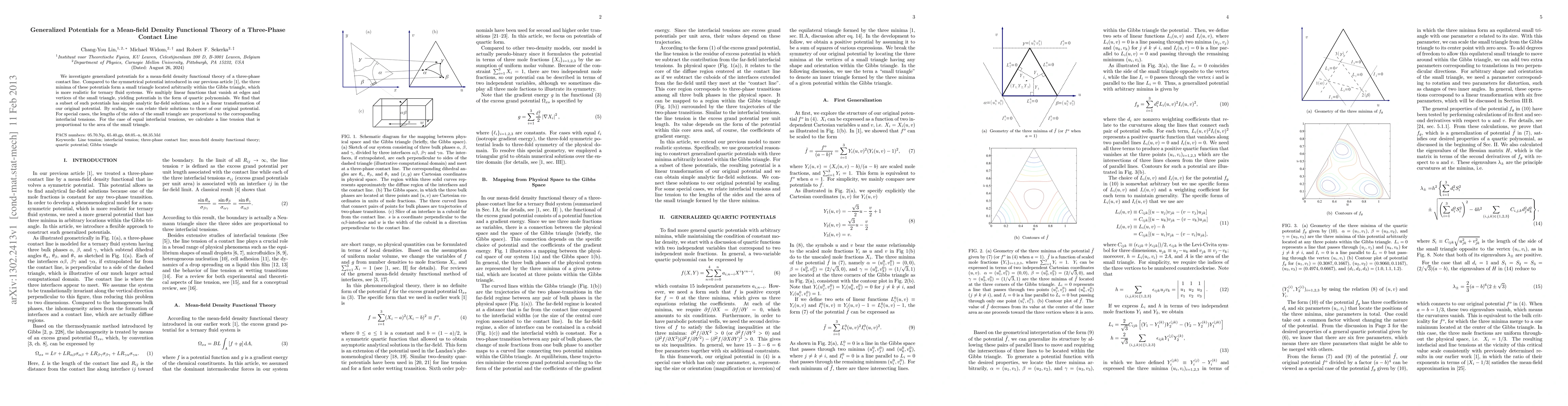 We investigate generalized potentials for a mean-field density functional theory of a three-phase contact line. Compared to the symmetrical potential introduced in our previous article [1], the three minima of these potentials form a small triangle located arbitrarily within the Gibbs triangle, which is more realistic for ternary fluid systems. We multiply linear functions that vanish at edges and vertices of the small triangle, yielding potentials in the form of quartic polynomials. We find that a subset of such potentials has simple analytic far-field solutions, and is a linear transformation of our original potential. By scaling, we can relate their solutions to those of our original potential. For special cases, the lengths of the sides of the small triangle are proportional to the corresponding interfacial tensions. For the case of equal interfacial tensions, we calculate a line tension that is proportional to the area of the small triangle.