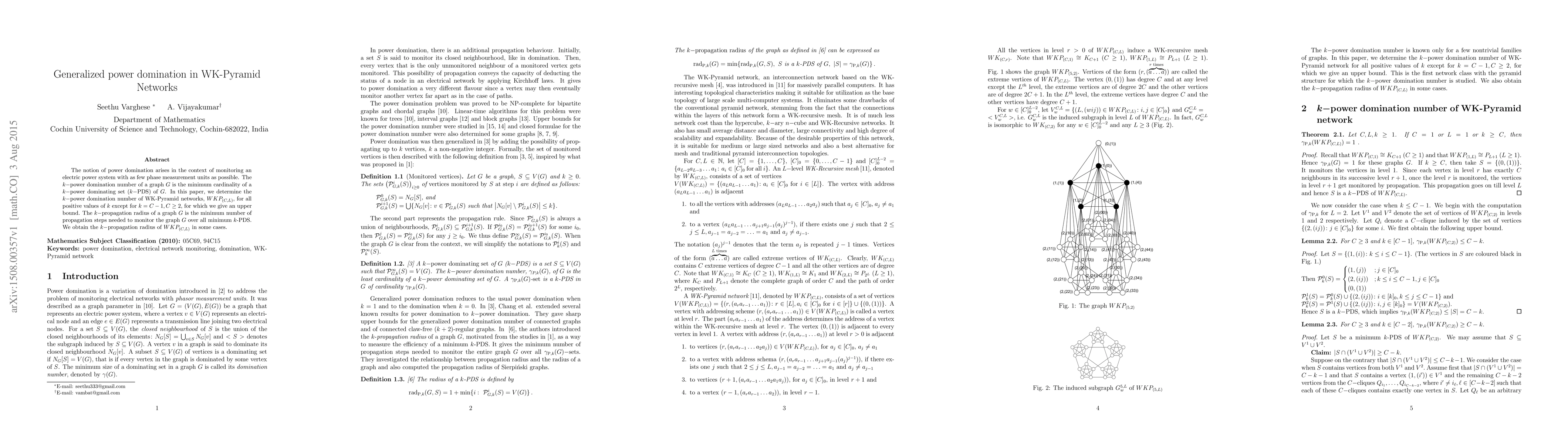 The notion of power domination arises in the context of monitoring an electric power system with as few phase measurement units as possible. The $k-$power domination number of a graph $G$ is the minimum cardinality of a $k-$power dominating set ($k-$PDS) of $G$. In this paper, we determine the $k-$power domination number of WK-Pyramid networks, $WKP_{(C,L)}$, for all positive values of $k$ except for $k=C-1, C \geq 2$, for which we give an upper bound. The $k-$propagation radius of a graph $G$ is the minimum number of propagation steps needed to monitor the graph $G$ over all minimum $k-$PDS. We obtain the $k-$propagation radius of $WKP_{(C,L)}$ in some cases.