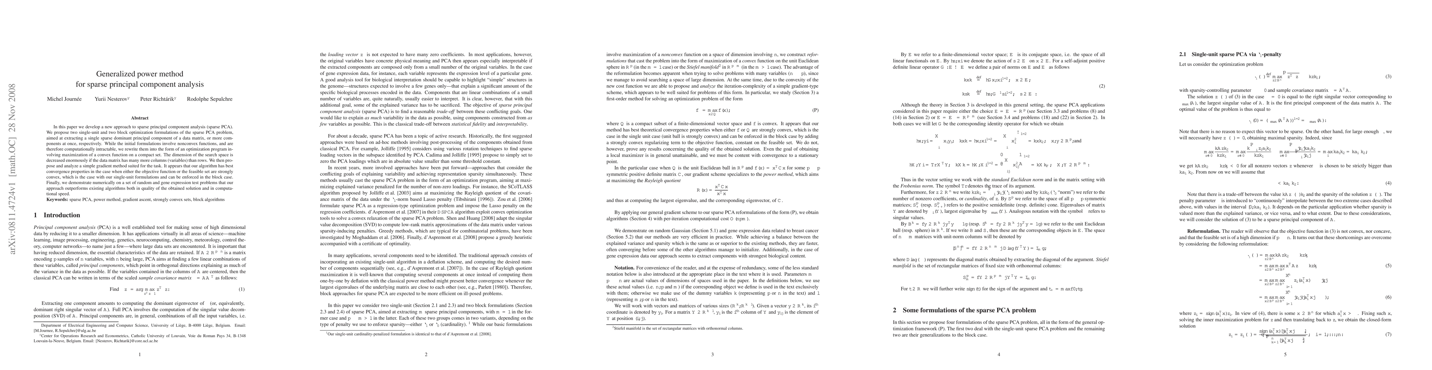This paper introduces a new generalized power method for sparse principal component analysis, proposing optimization formulations that maximize a convex function. The method is shown to outperform existing algorithms in both solution quality and computational speed, especially when the objective function or feasible set is strongly convex.