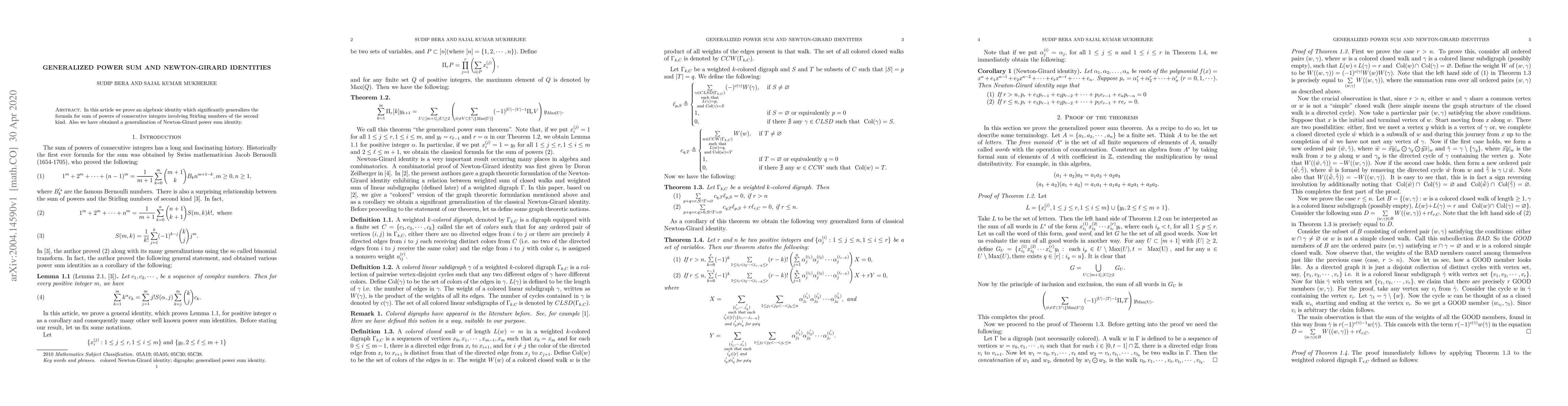 This paper proves a generalized algebraic identity for the sum of powers of consecutive integers, incorporating Stirling numbers of the second kind, and extends the classical Newton-Girard power sum identity. The results provide new insights into the relationships between power sums and combinatorial structures.