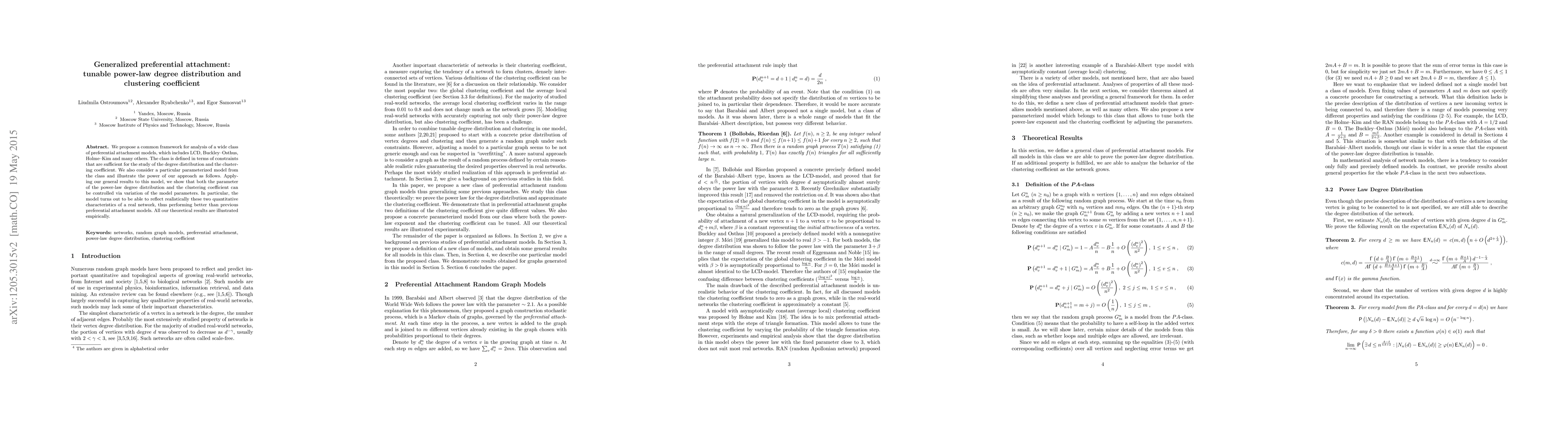 This paper presents a generalized class of preferential attachment models that allow for tunable power-law degree distributions and controllable clustering coefficients. The authors propose a specific flexible model and provide an efficient algorithm for generating such graphs, demonstrating their theoretical results through practical examples.