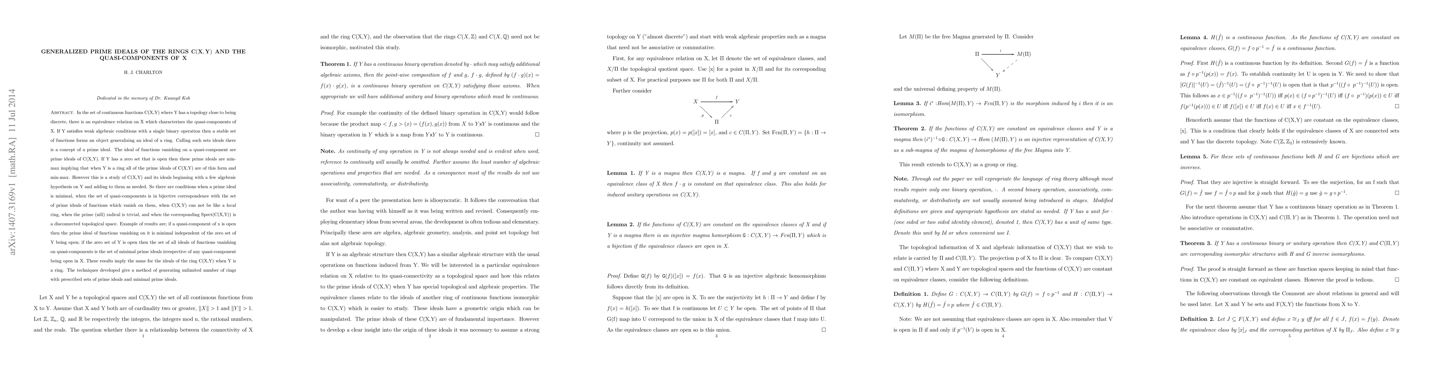 This paper explores generalized prime ideals in the ring of continuous functions C(X,Y), establishing conditions under which these ideals correspond to quasi-components of X. It reveals that under certain algebraic conditions on Y, prime ideals in C(X,Y) are minimal and can be generated by functions vanishing on quasi-components, leading to insights into the structure of C(X,Y) and its prime radical.