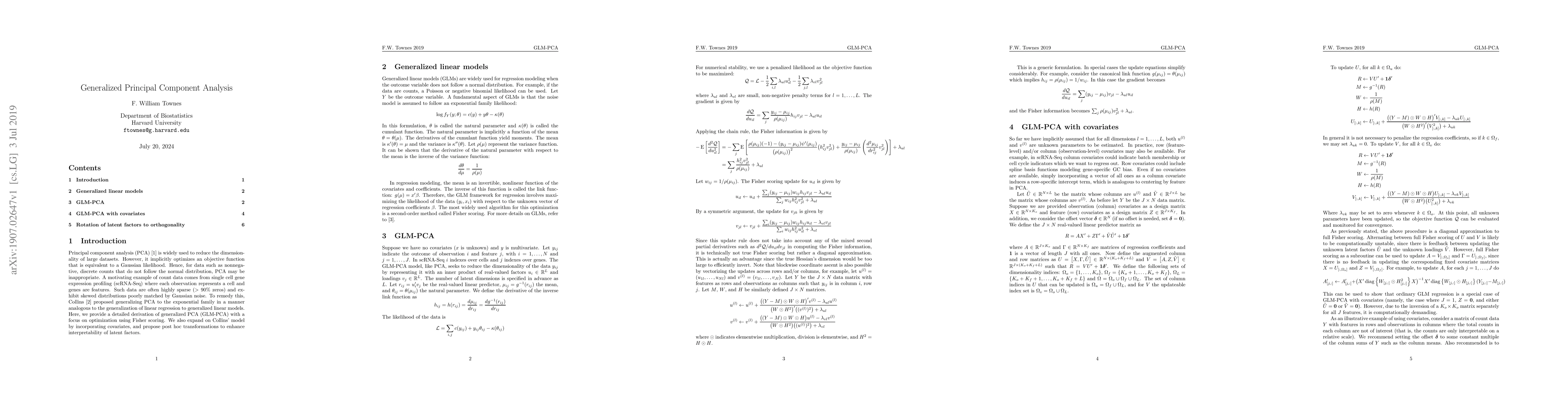 Generalized principal component analysis (GLM-PCA) facilitates dimension reduction of non-normally distributed data. We provide a detailed derivation of GLM-PCA with a focus on optimization. We also demonstrate how to incorporate covariates, and suggest post-processing transformations to improve interpretability of latent factors.