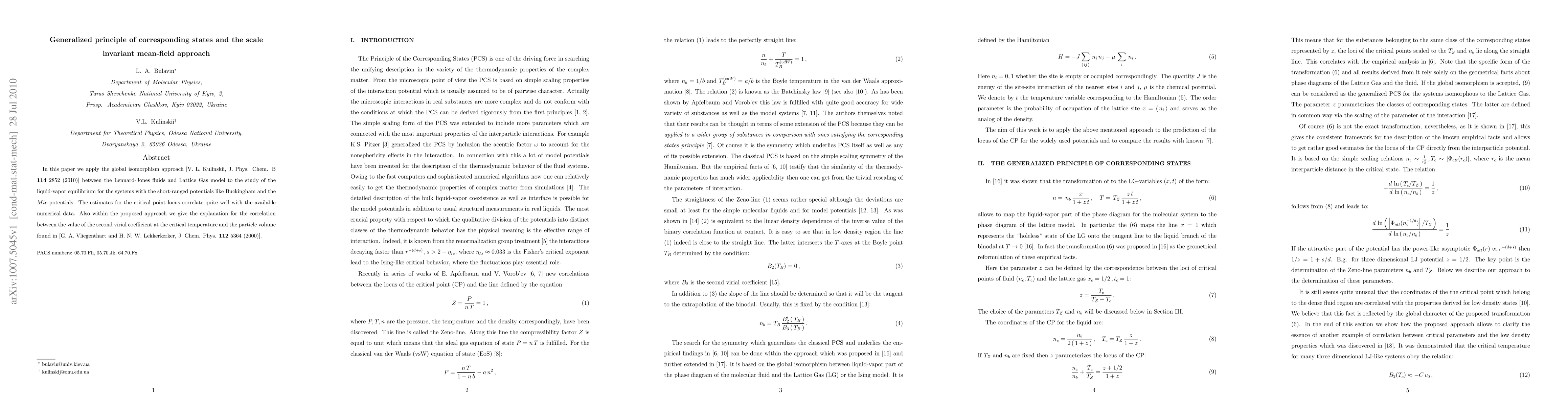 This paper applies the global isomorphism approach to study liquid-vapor equilibrium in systems with short-ranged potentials, correlating critical point estimates with numerical data and explaining the correlation between the second virial coefficient and particle volume.