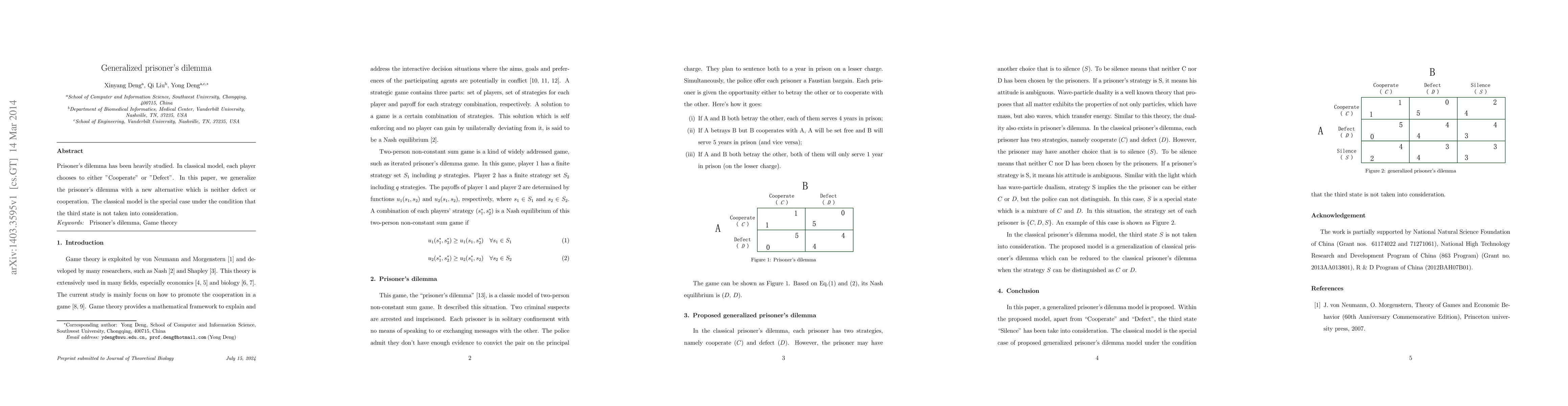 Prisoner's dilemma has been heavily studied. In classical model, each player chooses to either "Cooperate" or "Defect". In this paper, we generalize the prisoner's dilemma with a new alternative which is neither defect or cooperation. The classical model is the special case under the condition that the third state is not taken into consideration.