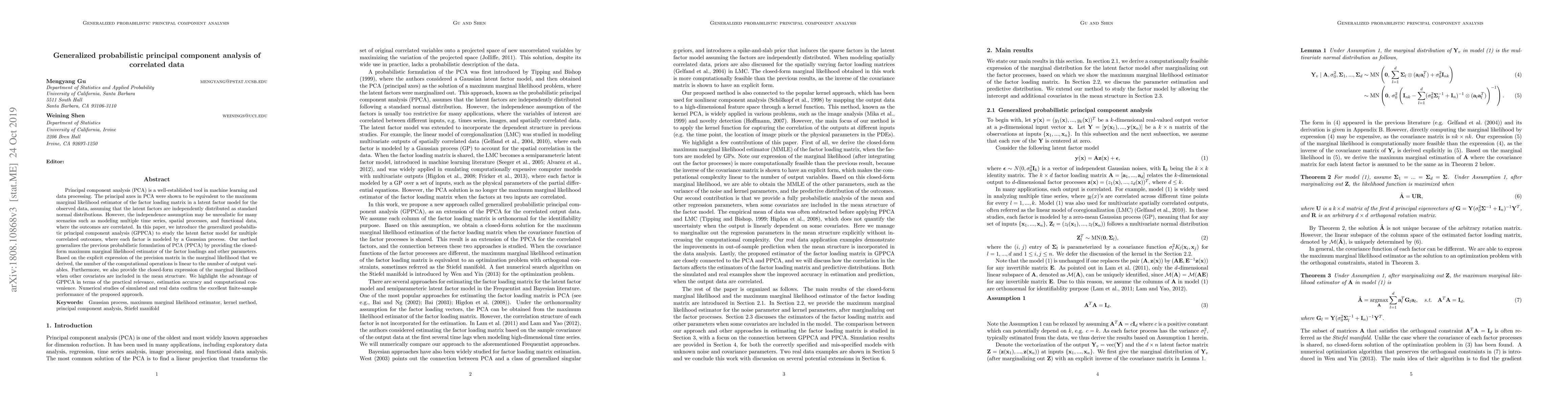 This paper introduces generalized probabilistic principal component analysis (GPPCA) to model correlated data, extending traditional PCA by using Gaussian processes for latent factors. The method provides a closed-form maximum marginal likelihood estimator, demonstrating practical relevance, estimation accuracy, and computational efficiency, as confirmed by numerical studies.