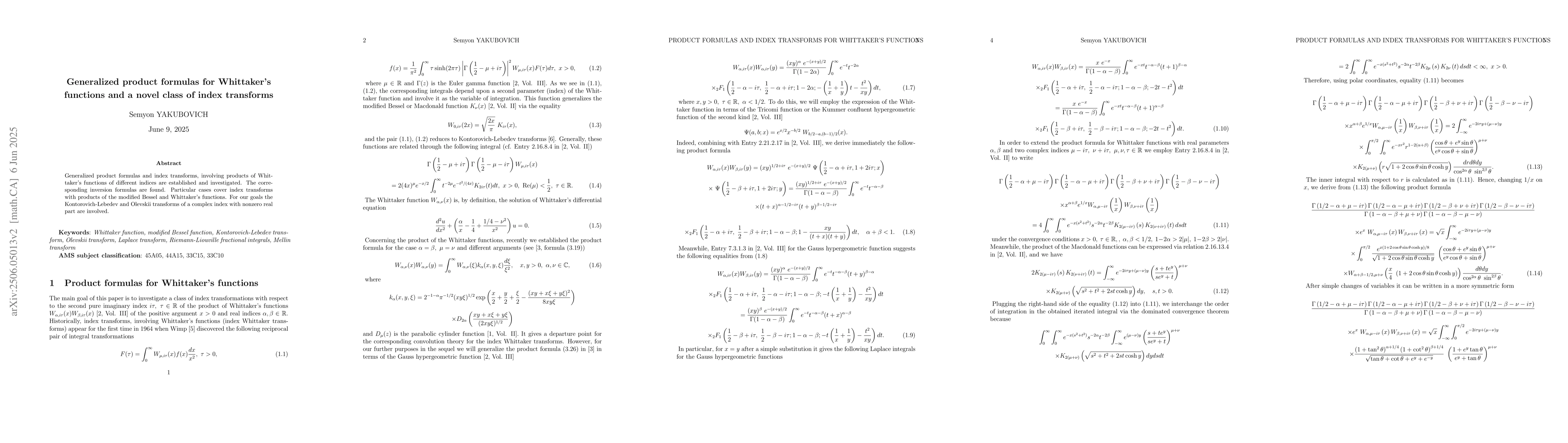 The paper presents novel generalized product formulas and index transforms for Whittaker's functions, along with their inversion formulas.