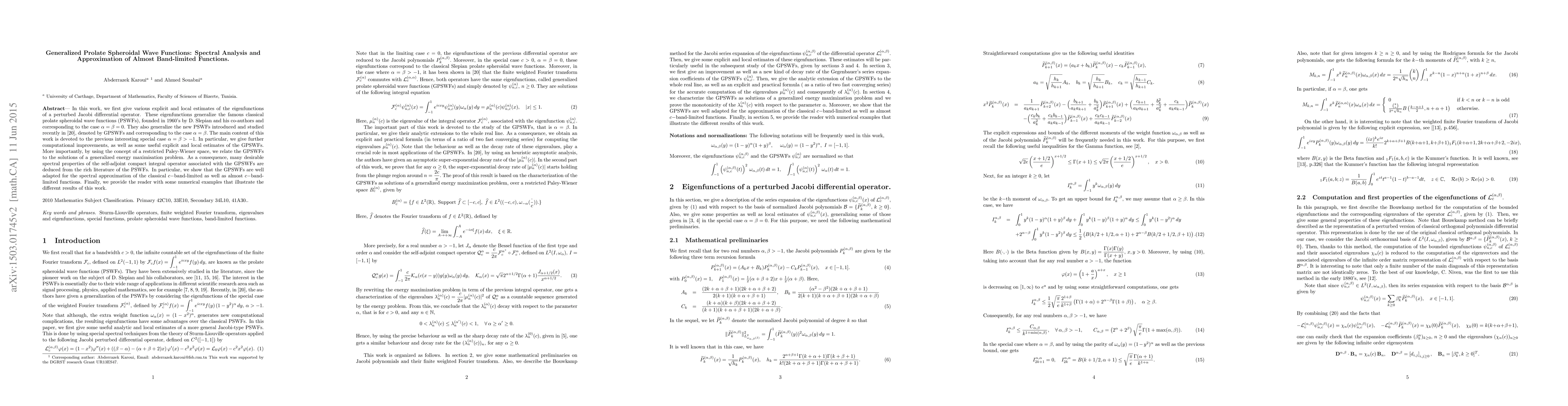 This paper generalizes classical prolate spheroidal wave functions (PSWFs) and introduces generalized PSWFs (GPSWFs) for spectral analysis. It provides computational improvements and local estimates for GPSWFs, showing their effectiveness in approximating band-limited and almost band-limited functions through a generalized energy maximization problem.