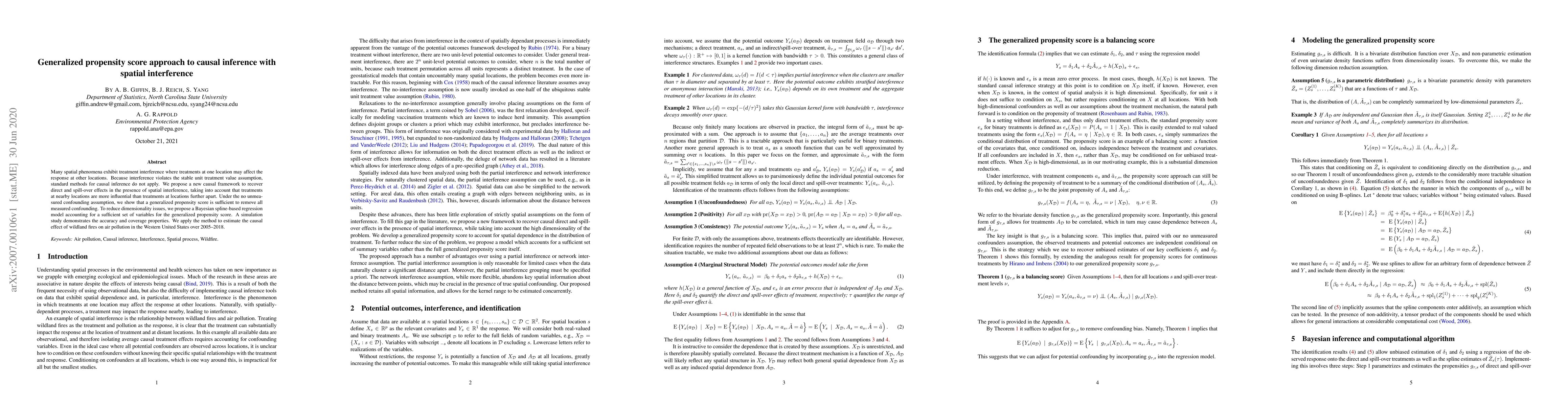 This paper proposes a generalized propensity score approach for causal inference in spatial interference scenarios, where treatments affect outcomes beyond their immediate locations. It introduces a Bayesian spline-based regression model to account for spatial proximity influences and demonstrates its effectiveness through a simulation study and an application estimating wildland fire impacts on air pollution.