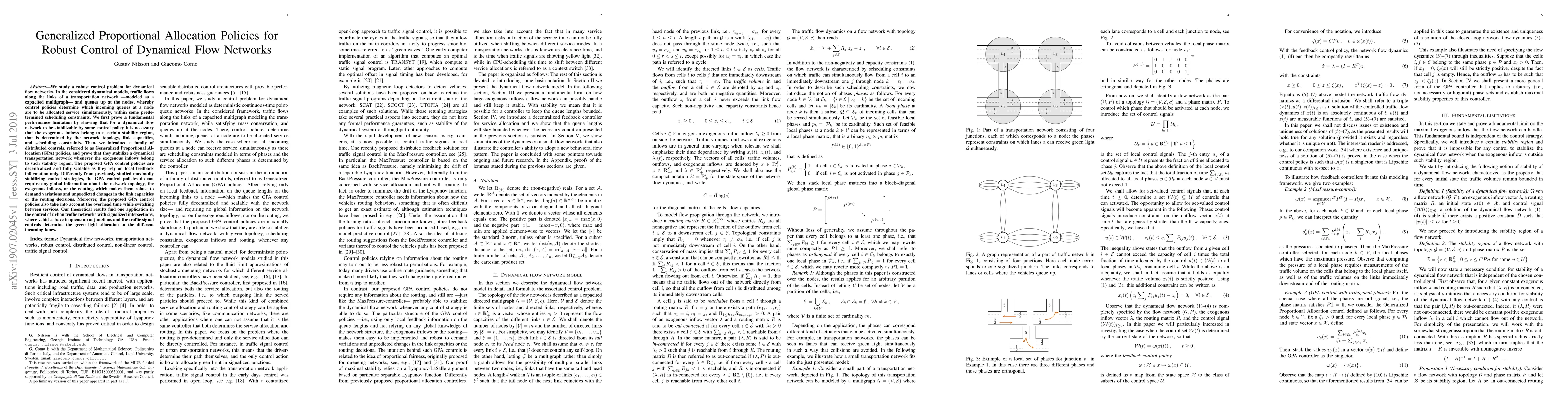 We study a robust control problem for dynamical flow networks. In the considered dynamical models, traffic flows along the links of a transportation network --modeled as a capacited multigraph-- and queues up at the nodes, whereby control policies determine which incoming queues at a node are to be allocated service simultaneously, within some predetermined scheduling constraints. We first prove a fundamental performance limitation by showing that for a dynamical flow network to be stabilizable by some control policy it is necessary that the exogenous inflows belong to a certain stability region, that is determined by the network topology, link capacities, and scheduling constraints. Then, we introduce a family of distributed controls, referred to as Generalized Proportional Allocation (GPA) policies, and prove that they stabilize a dynamical transportation network whenever the exogenous inflows belong to such stability region. The proposed GPA control policies are decentralized and fully scalable as they rely on local feedback information only. Differently from previously studied maximally stabilizing control strategies, the GPA control policies do not require any global information about the network topology, the exogenous inflows, or the routing, which makes them robust to demand variations and unpredicted changes in the link capacities or the routing decisions. Moreover, the proposed GPA control policies also take into account the overhead time while switching between services. Our theoretical results find one application in the control of urban traffic networks with signalized intersections, where vehicles have to queue up at junctions and the traffic signal controls determine the green light allocation to the different incoming lanes.