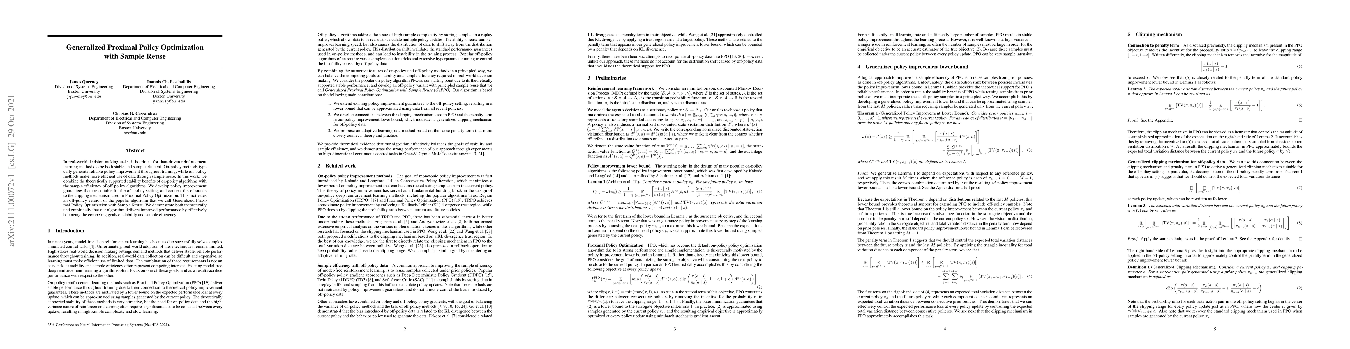 In real-world decision making tasks, it is critical for data-driven reinforcement learning methods to be both stable and sample efficient. On-policy methods typically generate reliable policy improvement throughout training, while off-policy methods make more efficient use of data through sample reuse. In this work, we combine the theoretically supported stability benefits of on-policy algorithms with the sample efficiency of off-policy algorithms. We develop policy improvement guarantees that are suitable for the off-policy setting, and connect these bounds to the clipping mechanism used in Proximal Policy Optimization. This motivates an off-policy version of the popular algorithm that we call Generalized Proximal Policy Optimization with Sample Reuse. We demonstrate both theoretically and empirically that our algorithm delivers improved performance by effectively balancing the competing goals of stability and sample efficiency.