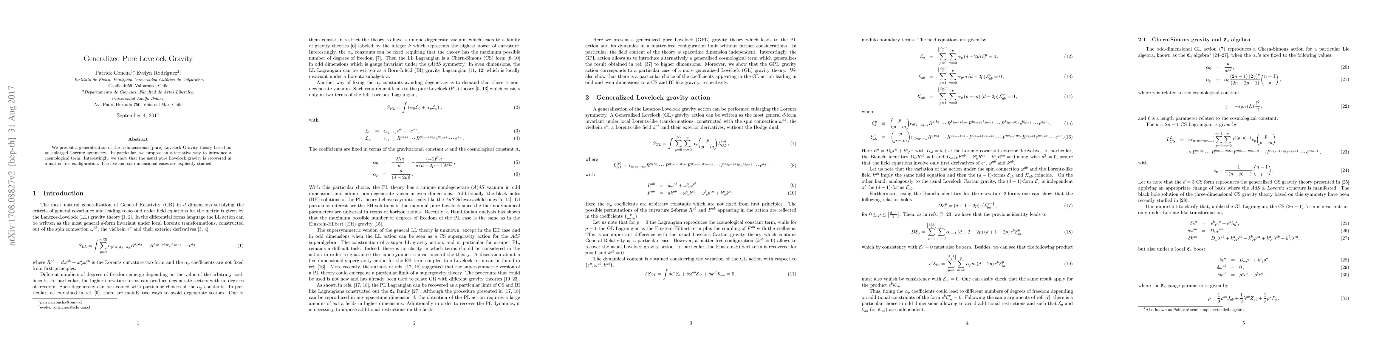 This paper generalizes n-dimensional pure Lovelock Gravity by expanding the Lorentz symmetry and proposing an alternative method for introducing a cosmological term. It demonstrates that standard pure Lovelock gravity is retrieved in a vacuum scenario, with detailed examinations of five and six-dimensional cases.