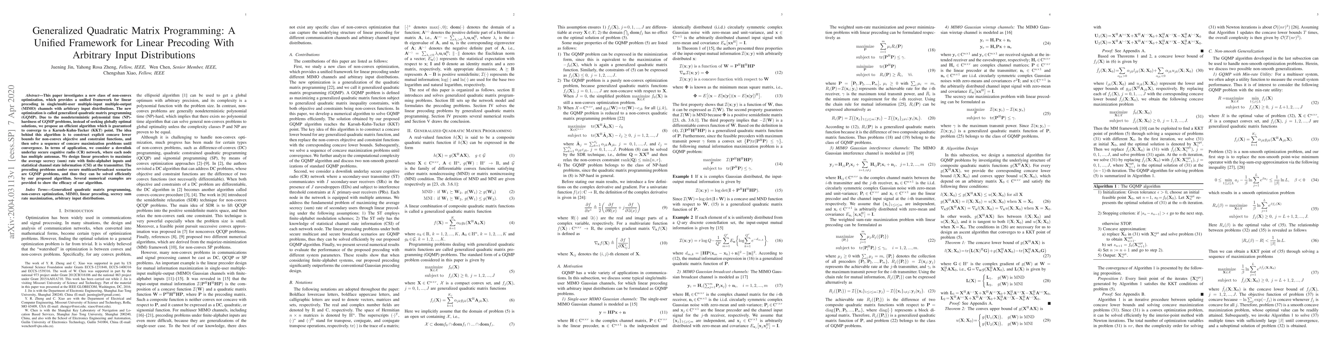 This paper investigates a new class of non-convex optimization, which provides a unified framework for linear precoding in single/multi-user multiple-input multiple-output (MIMO) channels with arbitrary input distributions. The new optimization is called generalized quadratic matrix programming (GQMP). Due to the nondeterministic polynomial time (NP)-hardness of GQMP problems, instead of seeking globally optimal solutions, we propose an efficient algorithm which is guaranteed to converge to a Karush-Kuhn-Tucker (KKT) point. The idea behind this algorithm is to construct explicit concave lower bounds for non-convex objective and constraint functions, and then solve a sequence of concave maximization problems until convergence. In terms of application, we consider a downlink underlay secure cognitive radio (CR) network, where each node has multiple antennas. We design linear precoders to maximize the average secrecy (sum) rate with finite-alphabet inputs and statistical channel state information (CSI) at the transmitter. The precoding problems under secure multicast/broadcast scenarios are GQMP problems, and thus they can be solved efficiently by our proposed algorithm. Several numerical examples are provided to show the efficacy of our algorithm.