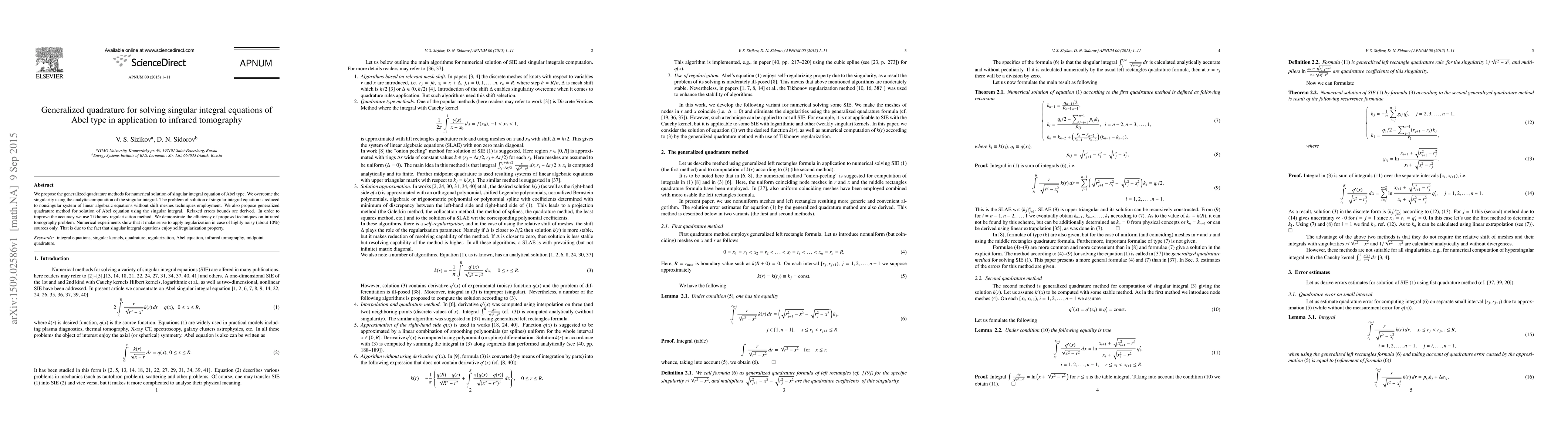 This paper proposes generalized quadrature methods for solving singular integral equations of Abel type, transforming them into nonsingular systems of linear equations. The approach includes Tikhonov regularization to improve accuracy, especially in noisy infrared tomography applications, leveraging the self-regularization property of the equations.