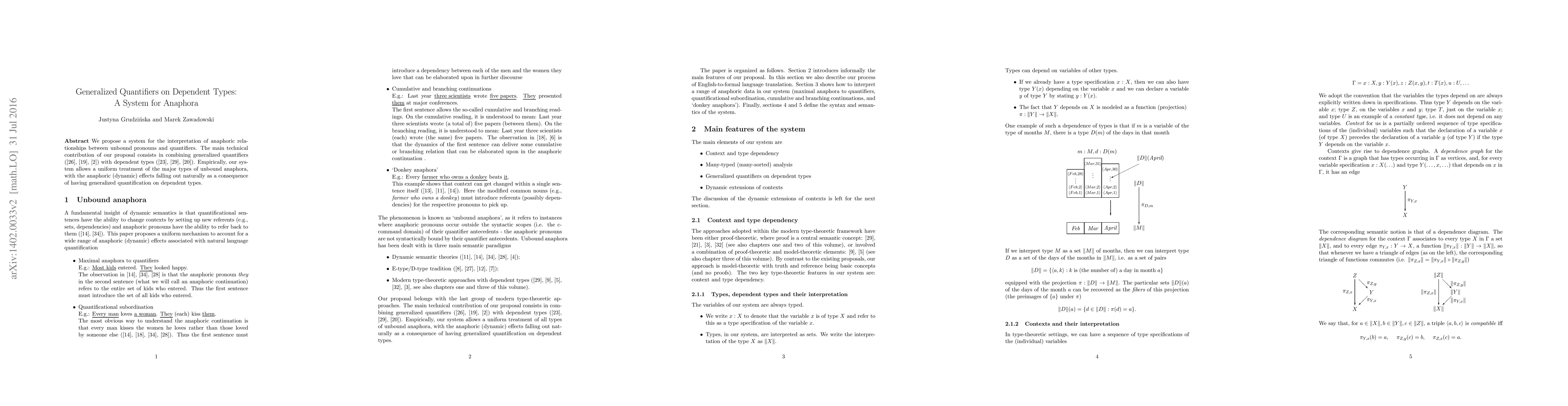 This paper proposes a system that integrates generalized quantifiers with dependent types to interpret anaphoric relationships, providing a uniform treatment for various types of unbound anaphora, including complex cases like quantificational subordination and 'donkey anaphora'.