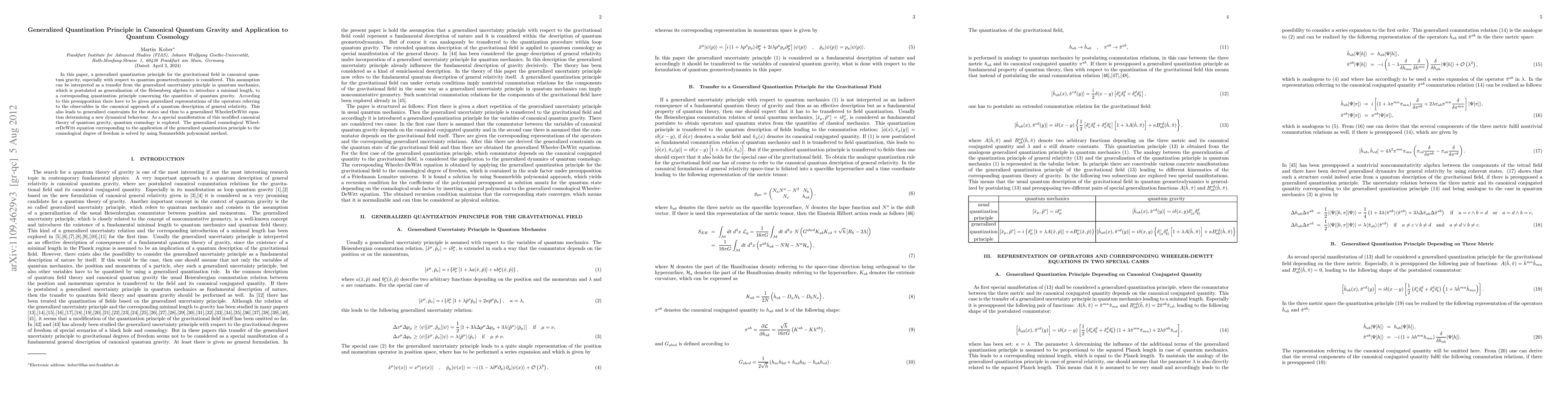 This paper proposes a generalized quantization principle for canonical quantum gravity, extending the generalized uncertainty principle to include minimal length and affecting quantum geometrodynamics. The study leads to a modified Wheeler DeWitt equation and explores its implications in quantum cosmology, solving the generalized cosmological equation using the Sommerfeld polynomial method.