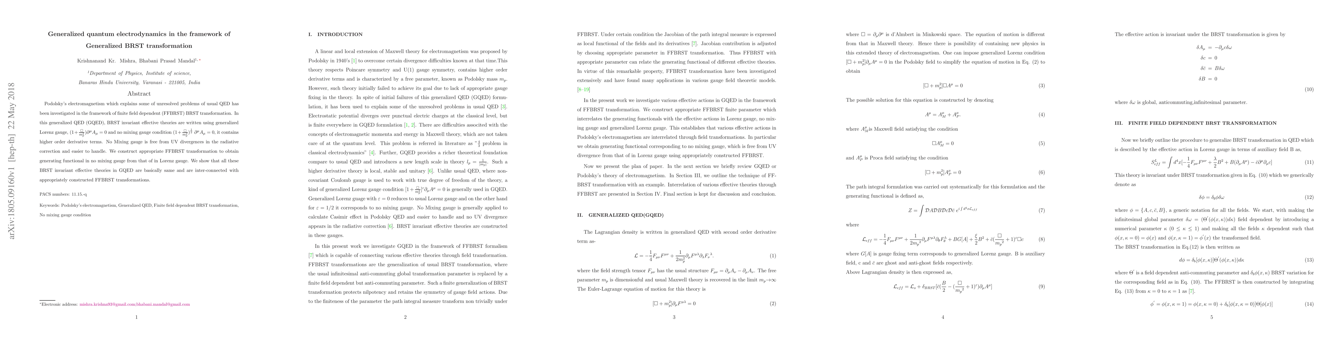 This paper explores Podolsky's generalized quantum electrodynamics (GQED) using finite field dependent BRST (FFBRST) transformations, demonstrating that BRST invariant effective theories in GQED are equivalent under appropriate FFBRST transformations. The no mixing gauge, free from ultraviolet divergences, simplifies radiative corrections.
