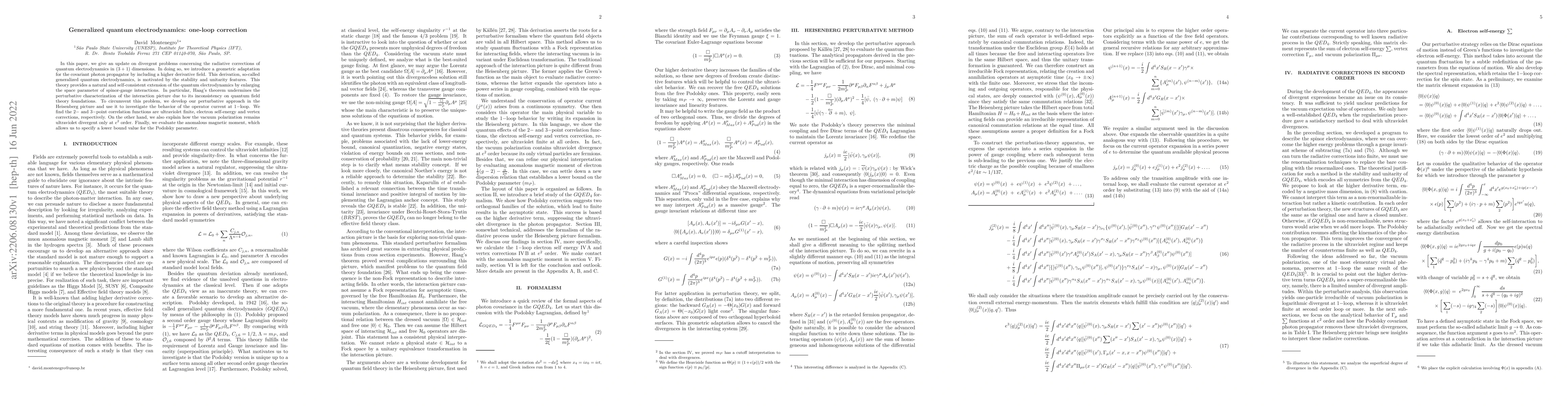 In this paper, we give an update on divergent problems concerning the radiative corrections of quantum electrodynamics in $(3+1)$ dimensions. In doing so, we introduce a geometric adaptation for the covariant photon propagator by including a higher derivative field. This derivation, so-called generalized quantum electrodynamics, is motivated by the stability and unitarity features. This theory provides a natural and self-consistent extension of the quantum electrodynamics by enlarging the space parameter of spinor-gauge interactions. In particular, Haag$'$s theorem undermines the perturbative characterization of the interaction picture due to its inconsistency on quantum field theory foundations. To circumvent this problem, we develop our perturbative approach in the Heisenberg picture and use it to investigate the behavior of the operator current at $1$-loop. We find the $2$- and $3$-point correlation functions are ultraviolet finite, electron self-energy and vertex corrections, respectively. On the other hand, we also explain how the vacuum polarization remains ultraviolet divergent only at $e^2$ order. Finally, we evaluate the anomalous magnetic moment, which allows us to specify a lower bound value for the Podolsky parameter.