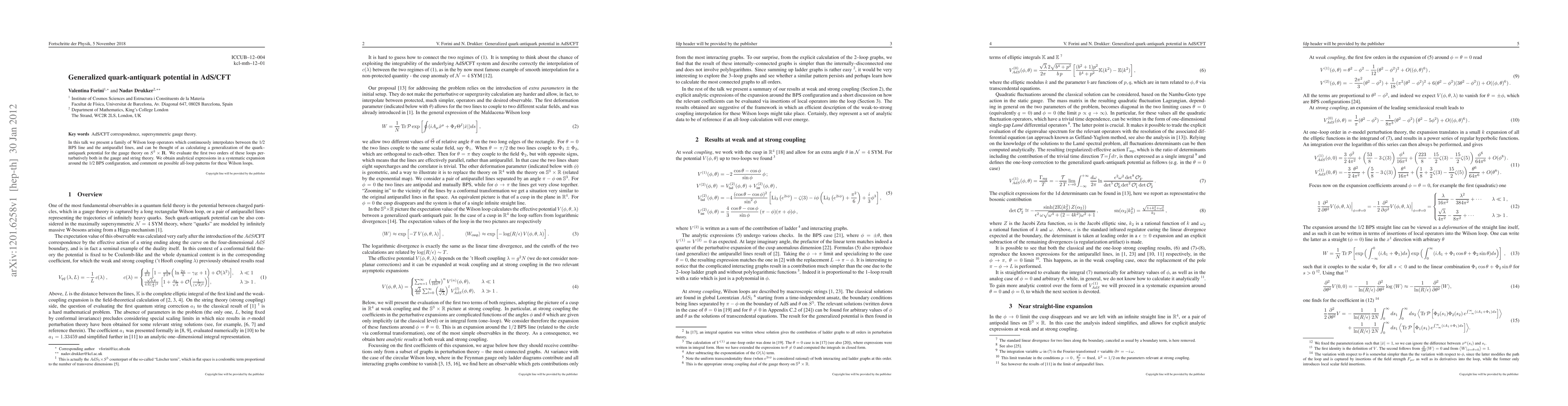 In this talk we present a family of Wilson loop operators which continuously interpolates between the 1/2 BPS line and the antiparallel lines, and can be thought of as calculating a generalization of the quark--antiquark potential for the gauge theory on S^3 x R. We evaluate the first two orders of these loops perturbatively both in the gauge and string theory. We obtain analytical expressions in a systematic expansion around the 1/2 BPS configuration, and comment on possible all-loop patterns for these Wilson loops.